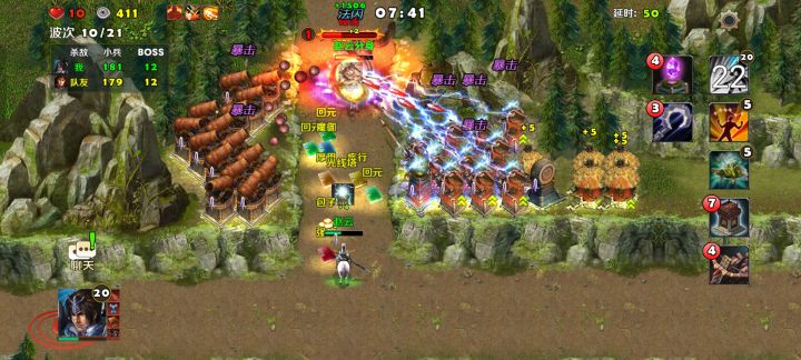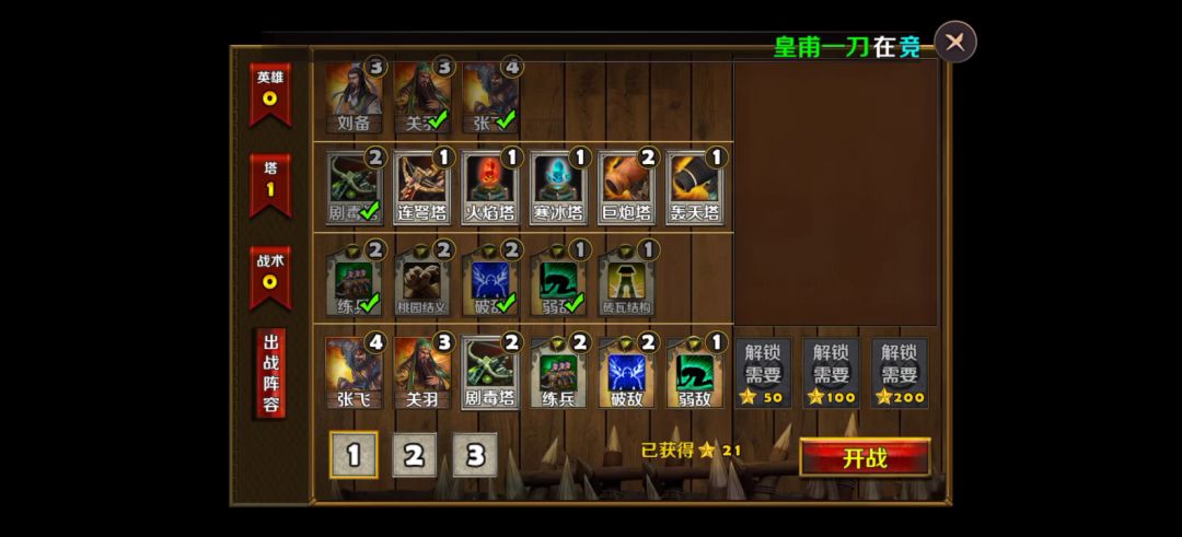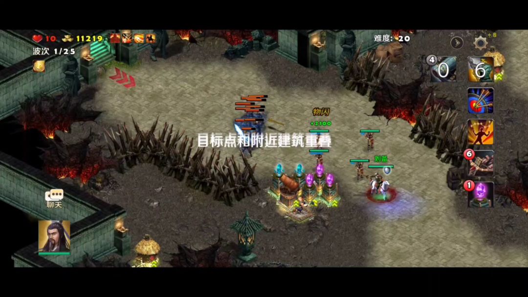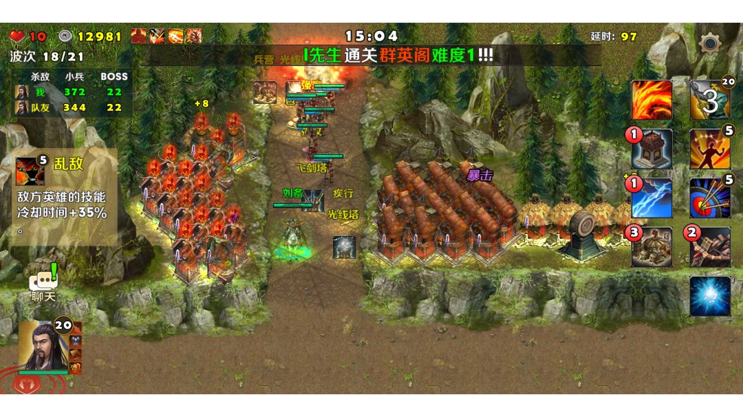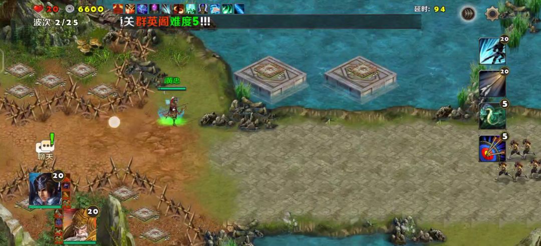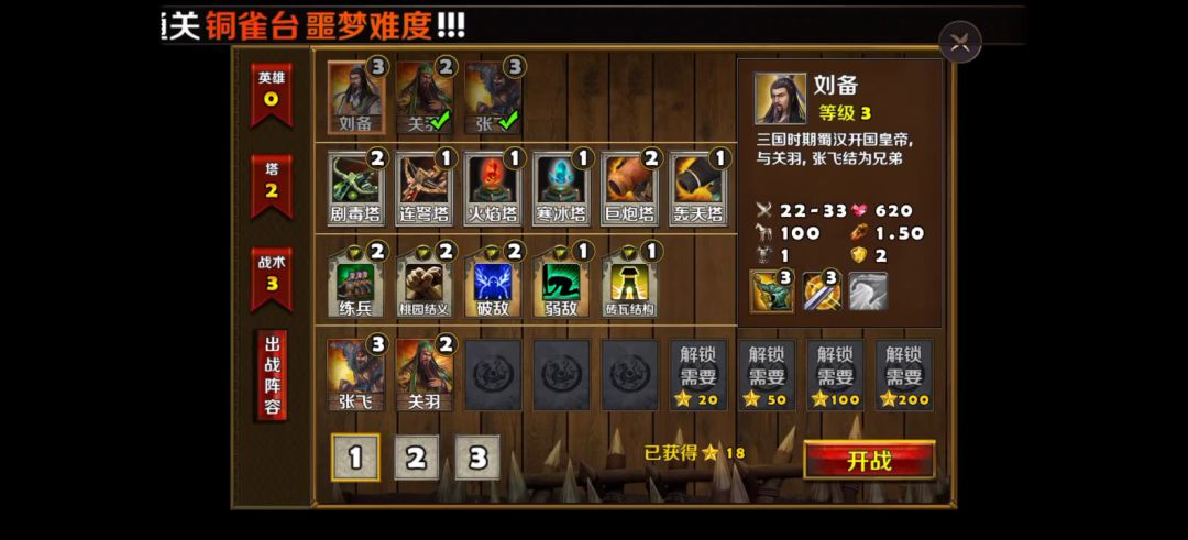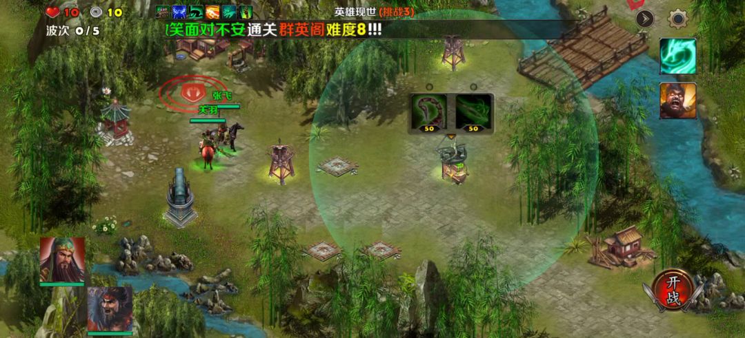 英雄选择刘备、关羽,装备如视频所示,防御塔使用剧毒塔、狙击塔,战术卡使用箭塔精通、修罗堡垒、亡命狙击、穿云一击、强化毒素、剧毒新星。 进入地图,刘备、关羽分别防守两个山洞口,另外一个山洞口由刘备召唤的小兵防守,然后在山洞口旁边建造几座防御塔,一切准备就绪之后,开战! 初始敌人都是一些小兵比较弱,轻易击杀收集金币,继续建造、升级防御塔,中间敌人会有一个boss出来,不过不强轻松击败,随着金币越来