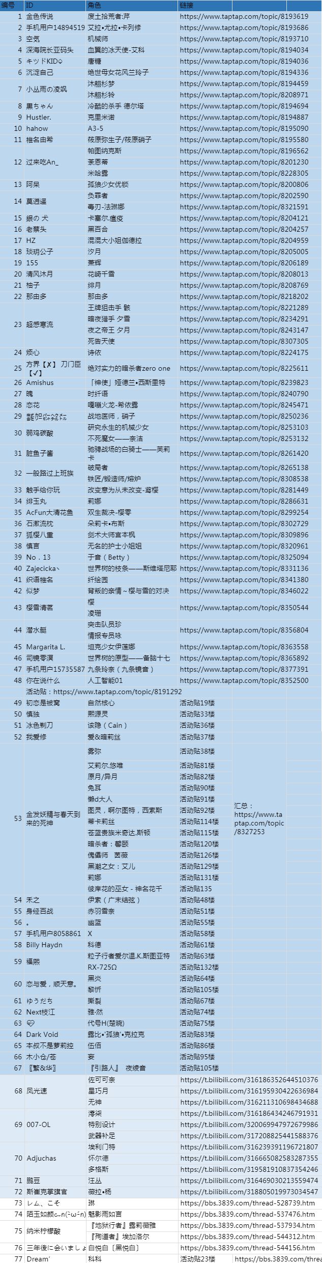 各位指挥官好呀~角色设计活动开启至今,我们收到了共计来自77位指挥官的108份投稿~真的非常感谢大家的踊跃参与!每份投稿兔耳都看了,各位指挥官都很有想法!投稿截止后兔耳大家的投稿提交给项目组内的“评审团”评选啦!兔耳温馨小提示:目前投稿已经截止啦!第二游戏制作组内部正在紧张地讨论中~15号将公布结果并进入投票环节!届时记得来看哦~以下是本次活动的投稿汇总~各位指挥官有兴趣也可以搜索查看哦~如果