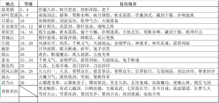 武学残章的出处,希望能帮到各位大侠。表中可能还有疏漏欢迎大家补充。残章优先买商店的,如果没有可以刷