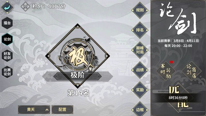 游戏版本:1.3.0这赛季的八门,上分之路可谓是艰难险阻,因为之前的遁甲八魔,莫名其妙的就各种赢不了。从当前论剑环境来分析,南拳刀魔不器门吃侠隐的福利;贪狼破盾,死前一波带走;恒山反击控制,幻影打不出伤害;华山双列缺速推,300时序暴毙;气宗铁石,其实也是侠隐福利,而且盾厚打不动。剩下的常规河洛,天武,华山或许能吃分,但又有多少呢?所以在这样的环境下,黄天速推就有了一席之地,先说一说最近论剑中