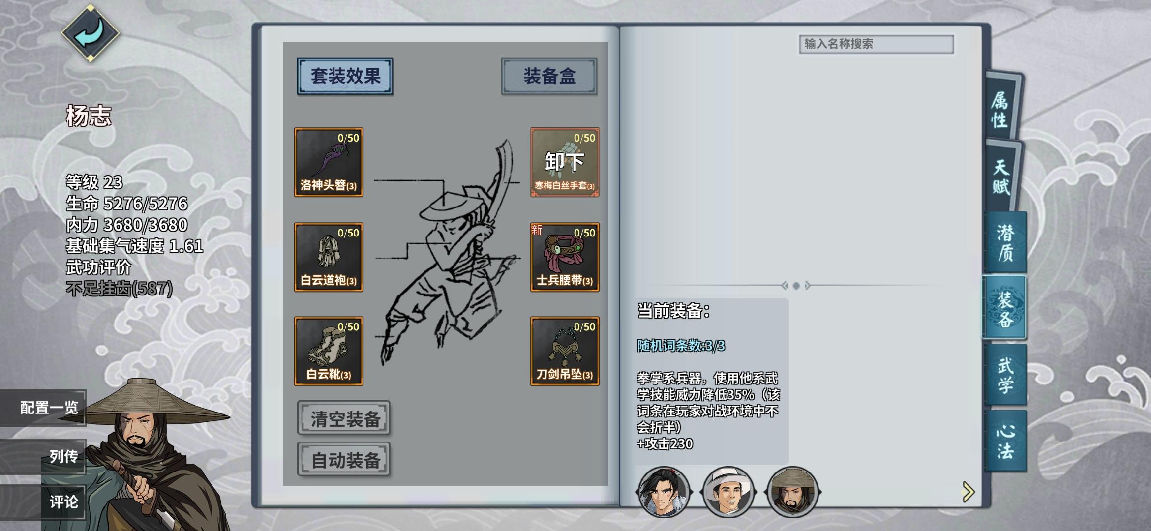 新手求教,刚刚接触这个游戏,感觉挺好玩的,但是好多东西还是搞不明白,特此求教:一、心法和武学,什么侠客适合什么样的心法和武学,有什么技巧吗?为什么一个侠客可以带很多武学和心法,打勾的才能生效吗?一个侠客下面配那么多武学和心法,只是用来方便切换吗?能同时生效吗?二、装备,什么样的装备是好的?打了很多新装备,却不知道换上哪个更合适,还有套装效果,什么样的侠客适合什么样的套装效果啊?三、心诀,好多