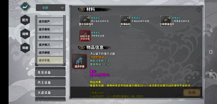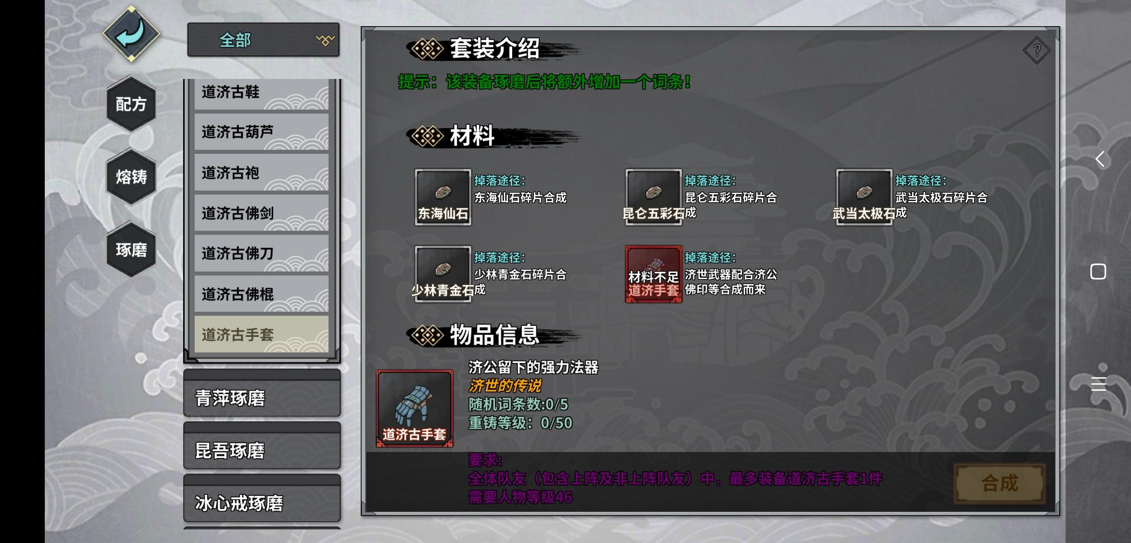 大佬们,求助😭关于装备合成这一块有个问题想请教一下:比如说以合成道济手套为例,我合成了道济手套(满词条),我拿着这个满词条的手套合成济世手套时,合成出来的济世手套是不是满词条的?还有如果我拿的是满词条的济世手套去琢磨,那琢磨出来的道济古手套是不是满词条的,还是说也是随机词条数?