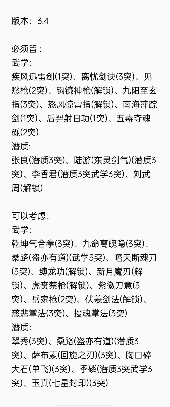 3.4版本开荒需要留的甲乙武学潜质