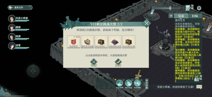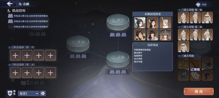 打法参考了这位大佬的帖子我刚开始用大佬的打法去实验,打不过,后来就自己研究了一套心决技能搭配,最后终于通关顺序水土金火毒,第一关水最难打,需要使用一次出奇制胜,外加主角使用一枚天佑之药(最贵的药,每周限购五枚,建议先不吃药尝试,觉得吃药能打过了再吃),只上阵主角、唐婉,唐婉挡刀,主角先打boss再打小兵,这里要注意走位,尽量不要触发左右云手打到小兵,打到了也没关系,死一两个小兵问题不大,只要不