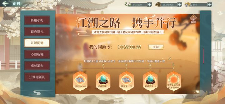 新手和回归玩家输一下同游令,每天都能领取元宝和祈福玉碎片等好东西同游码:U135GJ