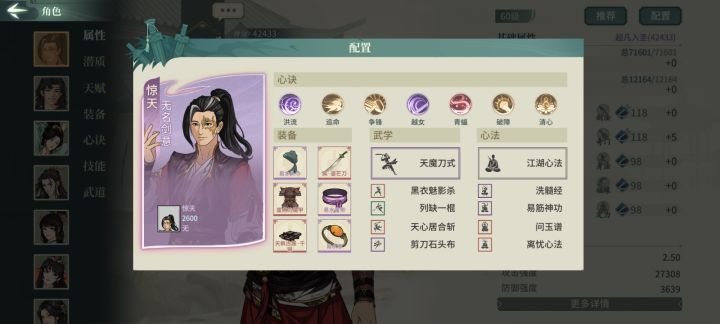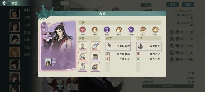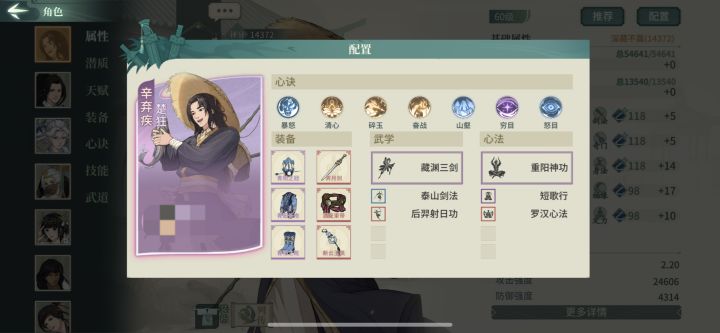 如图 配的褚姐(03) 在论剑基本出场一会儿就暴毙 闪避都堆到130%了 如同笑话。之前配的老辛(23)也是死的快。莫非必须给他们大藏和易筋才行? 主角刀魔 然后资源都给了苏轼 纳兰 风颖 师姐和景妈了或者褚姐必须33才能派得上用场吗#汉家江湖