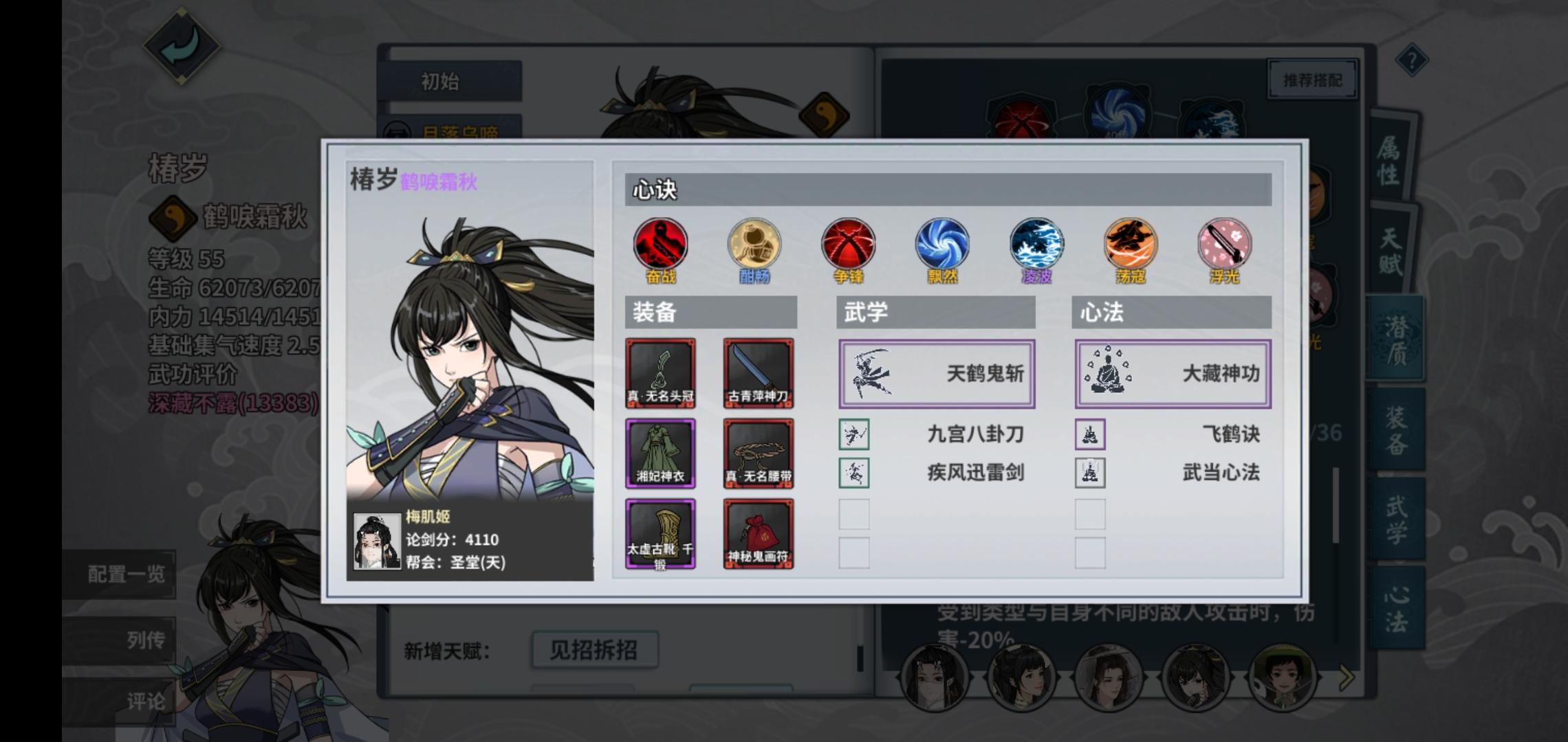 今天4100守门,体验很差。又是禁又是抢的,下定决心做一个90%平局的唐婉。拉满,通通拉满😠😡36器就好了,可以放多一个卸力再来一个真肉椿岁,整个伍子胥压阵。完美得一笔ps,补充一个正经的唐婉,走纯减伤路数。29器用尽,31器可以将山岳换成争锋,同时把天柱甲替换成最高级别的减暴击套。减伤15+15+16+20=满需要禁怒和尚
