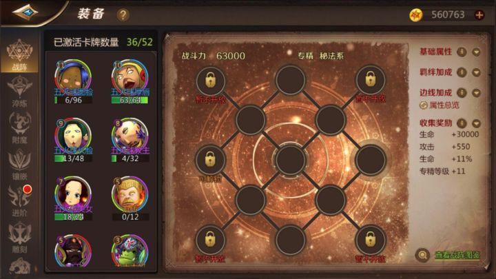 多说无益 战阵系统大家伙都多多少少的了解了 本人也就不再多废话 这套战阵 在13孔全开的情况下 羁绊秘法+60% 图一的萨满是p 的 因为卡牌等级的问题 本人选择用等级高的 关于洗边线的问题 还是先洗中间 然后洗边上的 拿走 不谢