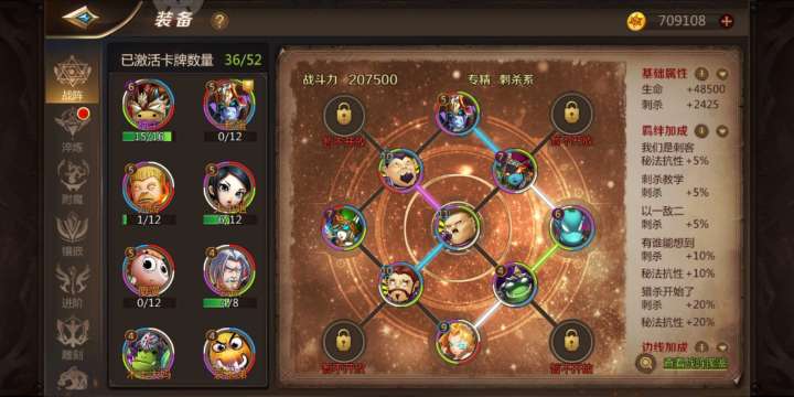 众所周知,战阵属性属于独立与攻击之外的属性,因副本BOSS无对应抗性,故PVE,收益显著;PVP中收益亦大于攻击。如何设置好战阵属性尤为重要。提升战阵属性共4个方面:1、提升上阵卡牌等级;2、提升未上阵卡牌数目及等级激活战阵图鉴属性;3、激活上阵卡牌羁绊属性;4、激活上阵卡牌边线属性。本人主玩刺客,猎人、黑暗骑士,刺客刺杀精通15%;猎人、黑暗骑士刺杀精通12%、狂暴精通12%,故综合考虑,选择
