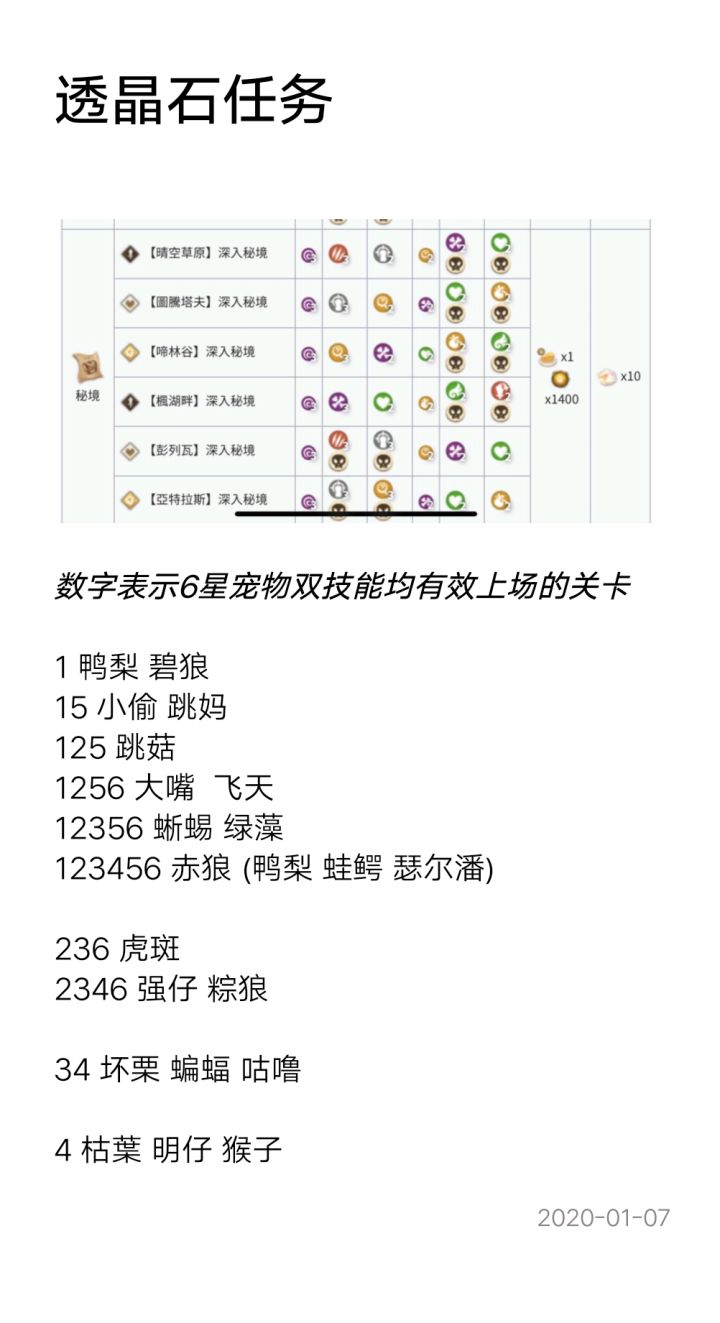 透晶石任务培养https://www.taptap.com/topic/8649939推荐顺序:蝙蝠雄仔绿藻或强仔大嘴最后升绿藻强仔中没有6的一个以下为推算资料6级任务每个数字对应的宠物练一只7级任务需要123456重复一遍