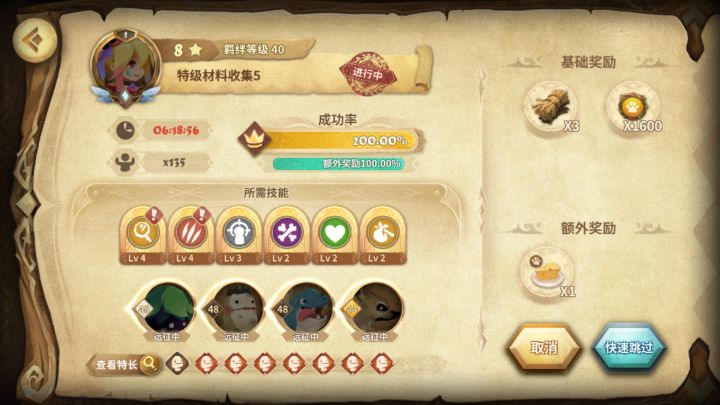 先说目的:本指南旨在以最少的天赋传承次数,以达到一个高成功率(≥180%)的效果。———————效果预览———————主力宠物看本帖一楼~前两个奶酪球和透晶石任务同时开工,下午就能开两个奶酪球,最后蓝碎任务下午开工,晚上就可以拿到手了~————————结论————————1、需求8星宠物(此排序按重要程度排!优先奶酪球任务):①绿藻球,搜索+再生②鸭梨趴趴(蛙鳄亦可),晕眩+嘲讽/撕