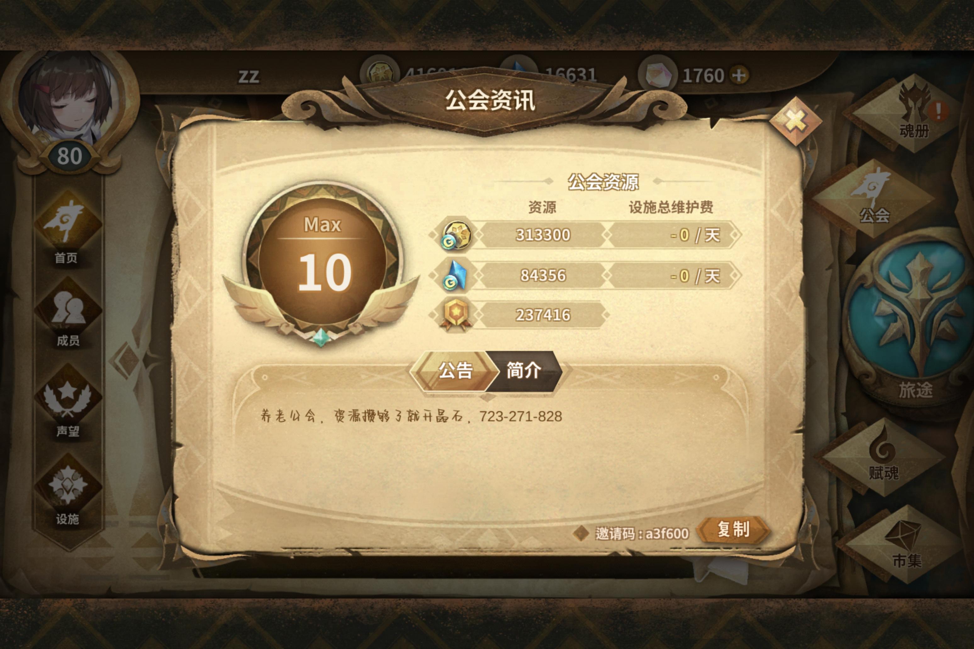 从初中玩到大学毕业,这个公会从当年3天不上线就清人到现在清一色的一年前甚至两年前登录,只能说感慨良多,现在公会管事的只有我保持每天登录,所以希望有一些活跃的玩家能加入到这个公会里来,公会资金足够开设施的时候就会开,主要是开晶石,其他的如果资金充裕再考虑(虽然知道已经没什么玩家了,但还是挣扎一下🤧)公会码 a3f600
