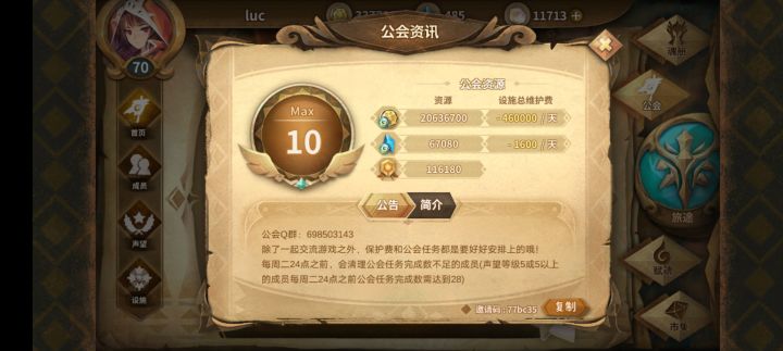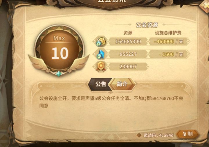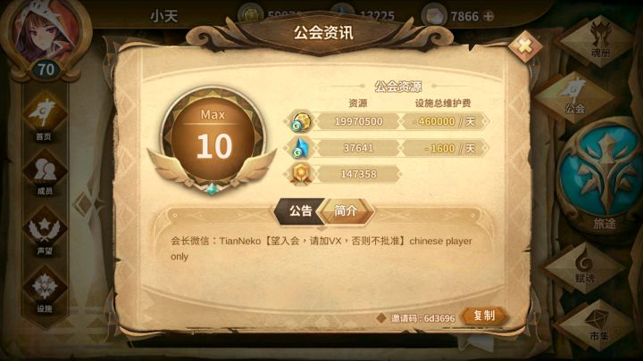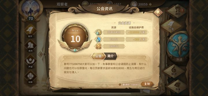 设施全开十级公会 欢迎各位萌新与大佬!公会邀请码:e7a7d6 群号:179137478(不强制加群 不过欢迎氵群哦)还有大佬在线解答各种问题~不要求额外捐献物资 只需要清空每日公会任务就足够啦
