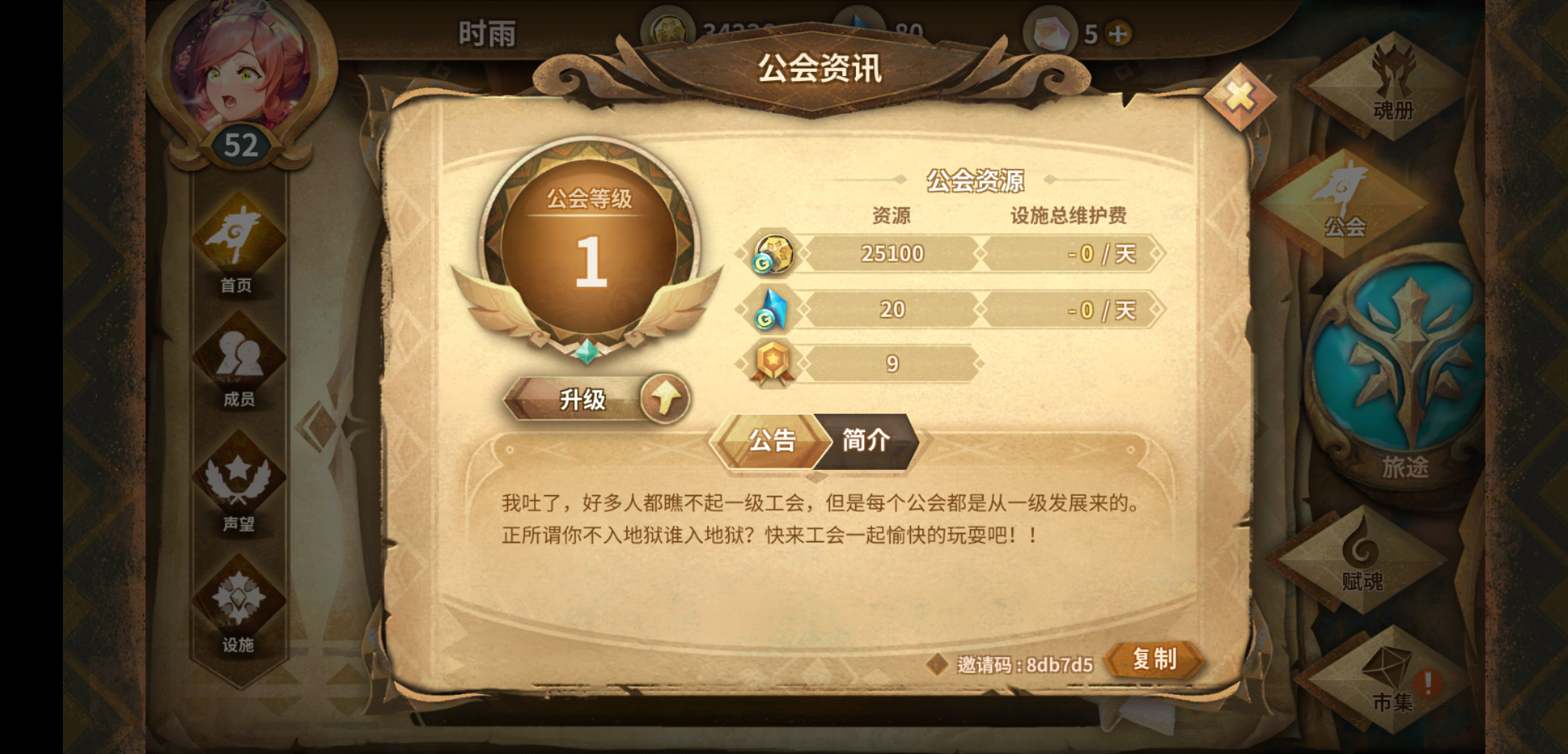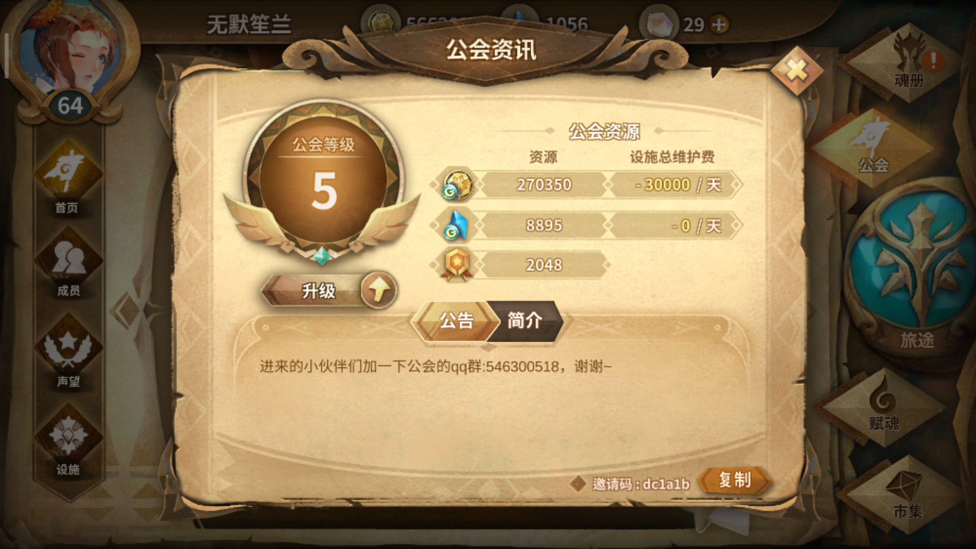 5级公会招人啦,对捐献和等级都没有任何要求,常开设施魂能,每天抽空打打公会任务即可,有什么疑问欢迎在公会群里一起交流哦,欢迎你的加入(◦˙▽˙◦)~~公会邀请码:dc1a1b