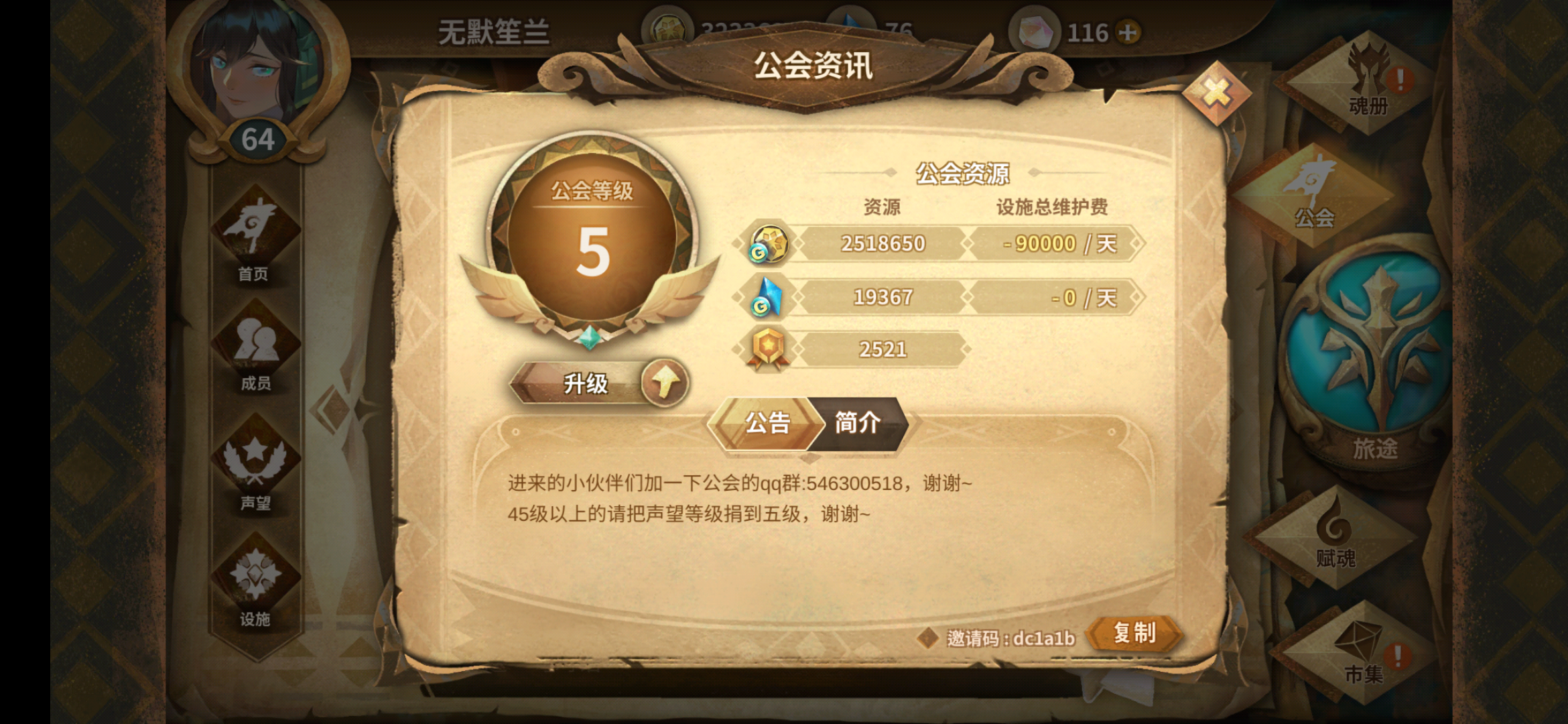 新开的公会,寻找同为萌新的你一起建造,邀请码私