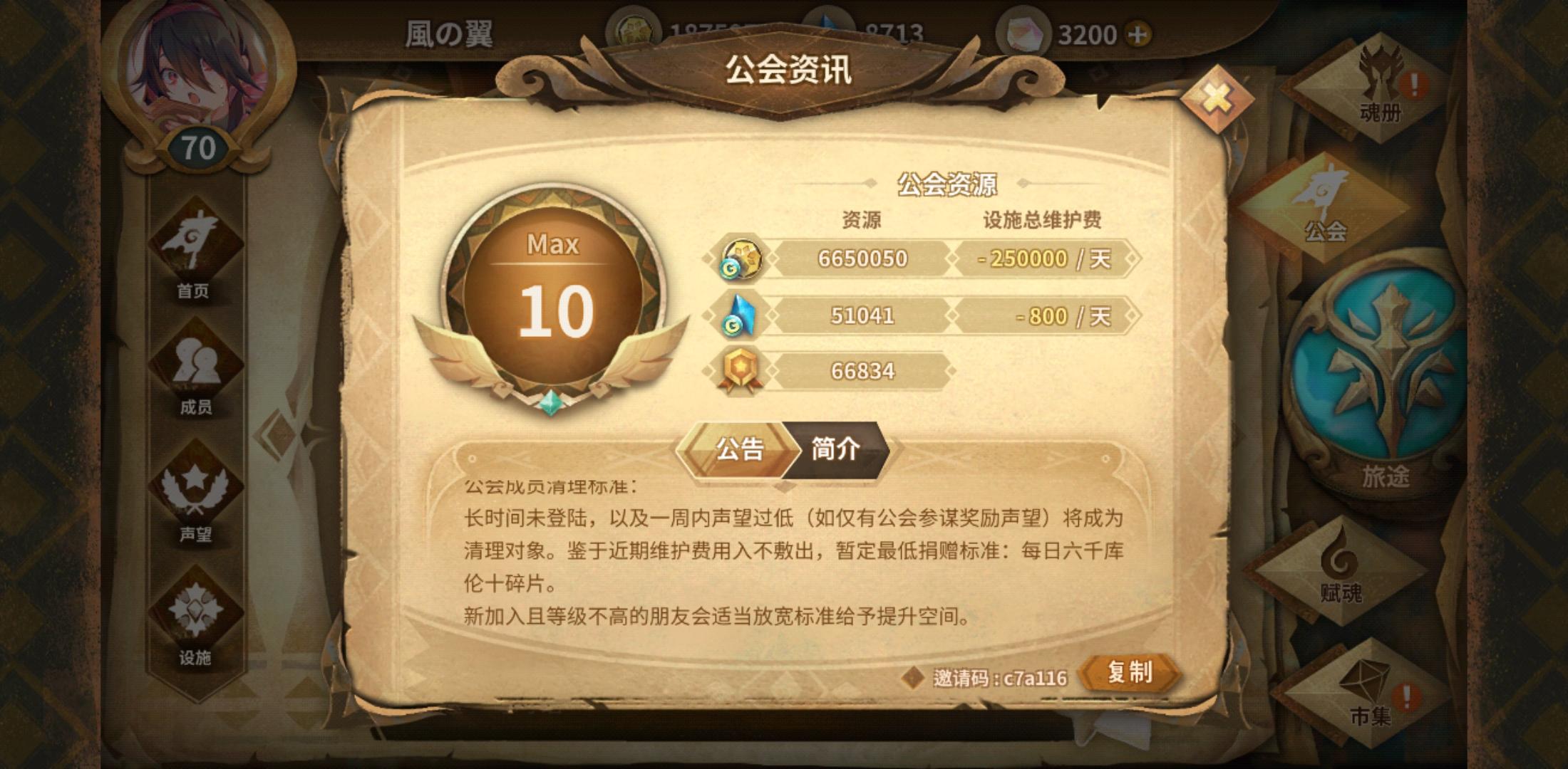 10级公会招人招每天至少能把公会资源任务做完的,声望当然是越高越好为了开绿票,肝了邀请码:c7a116