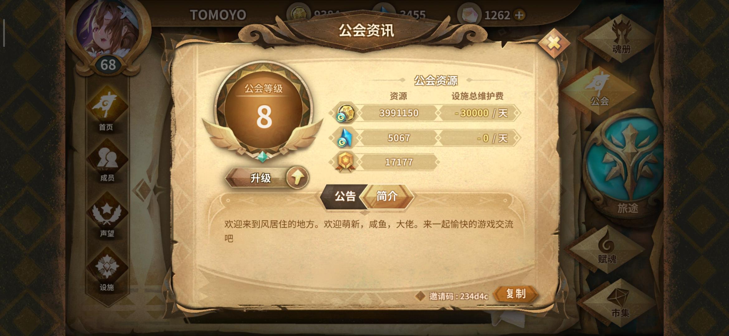 公会招人公会名:风居住的地方要求:每天上线,公会任务尽量做设施:奖章和魂能邀请码:234d4c欢迎大家来公会,群里会长几乎都在。虽然公会不是很强但还是陈恳的希望您的到来