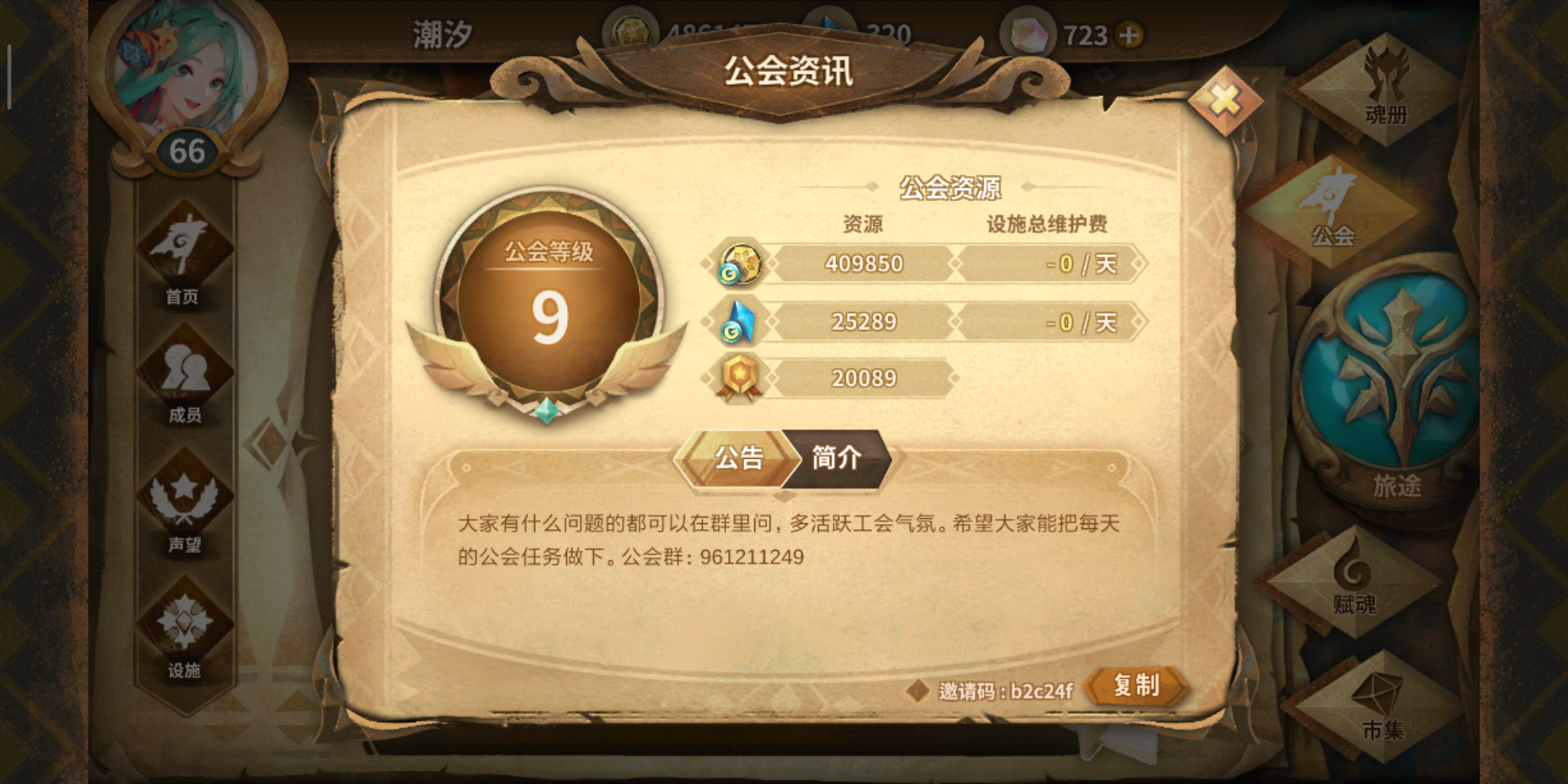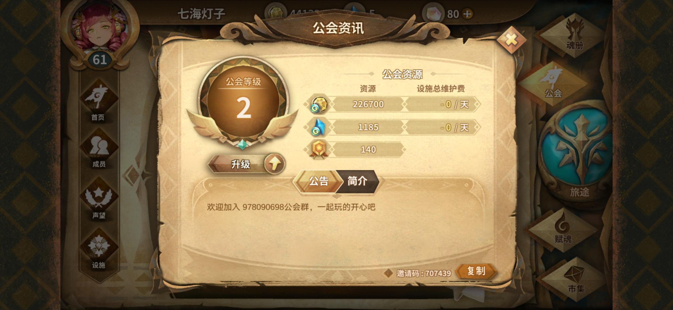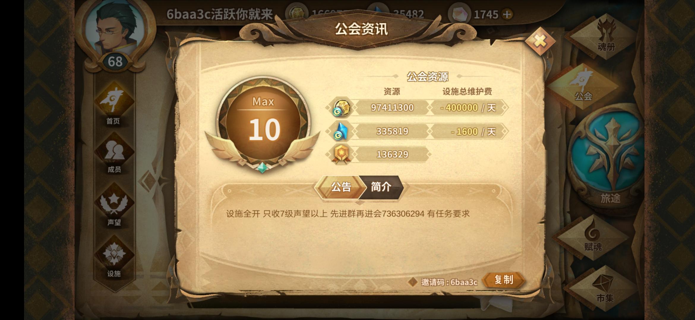 设施全开,要求声望6级以上,每天清任务,活跃最好,邀请码11efd1工会群 745815594来嘛来嘛,欢迎各路萌新咸鱼大佬