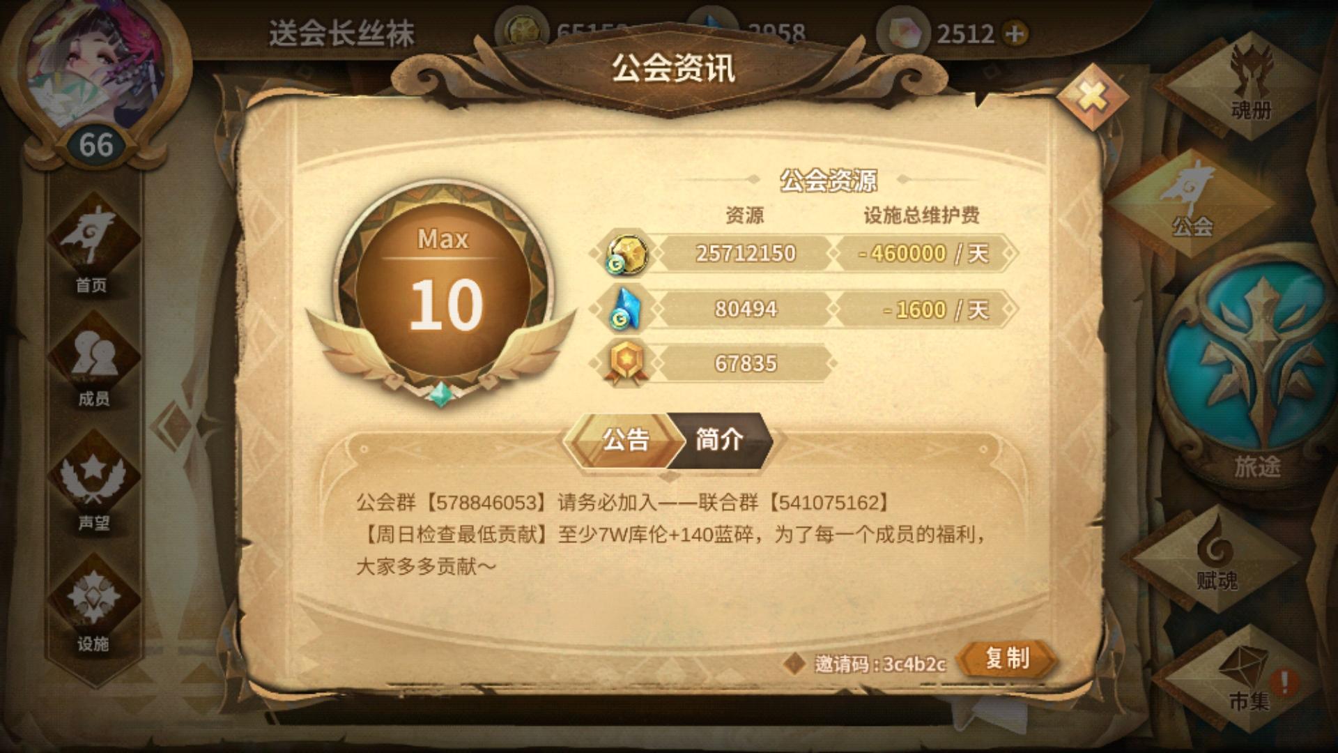 没有等级要求,萌新也没关系,但是请注意避免长时间不上,5天会进行清理的鸭~目前总体还算活跃,每天会有1~2个坑位这样子设施长期开魂能、素材、晶石,然后每天完成公会任务即可,不强制要求做库伦和蓝碎捐献任务(其实捐献任务性价比挺高的),在这里的话请先进群报一下ID ,会排队通过的~ 新开的扣群:620440444邀请码:2fe51e欢迎大家进群交流~