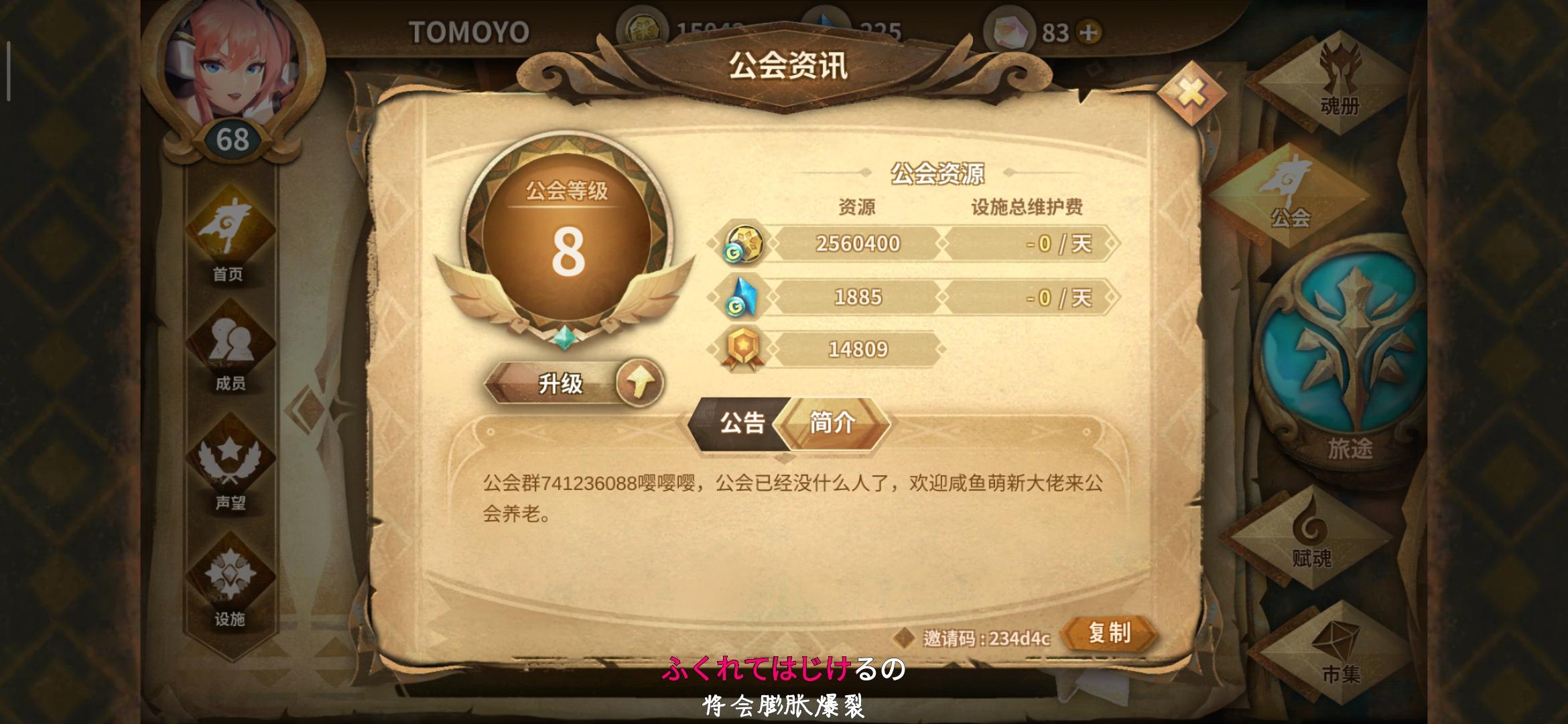 公会邀请码54e81b萌新都可以来,要求很低,不要长时间不在线就行
