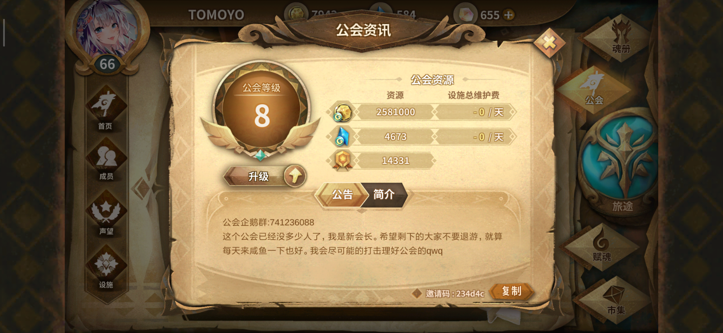 此处三级小公会~不过马上就要四级啦(✪▽✪)欢迎长期玩游戏的小可爱(๑• . •๑)不要活死人,经常做任务上线聊聊天。还可以加q群大家水水群,热热闹闹得多好鸭( ¨̮ )邀请码:f1b f37(为避免删帖,我空格了(ಥ_ಥ)最后再一次热烈欢迎大葛们!!!