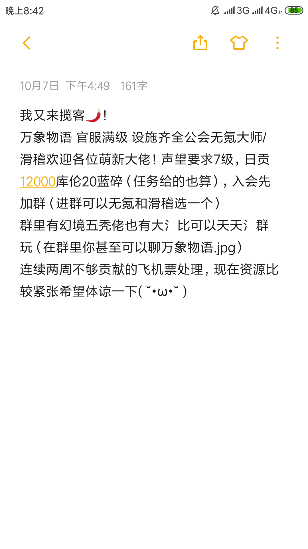 公会设备福利全开,招收活跃玩家,最低5级声望要求,要是你愿意进来直接捐到5级也可以收。每天任务全清,周贡必然达标。白嫖混子请绕道!有兴趣的可以先加群:137380921