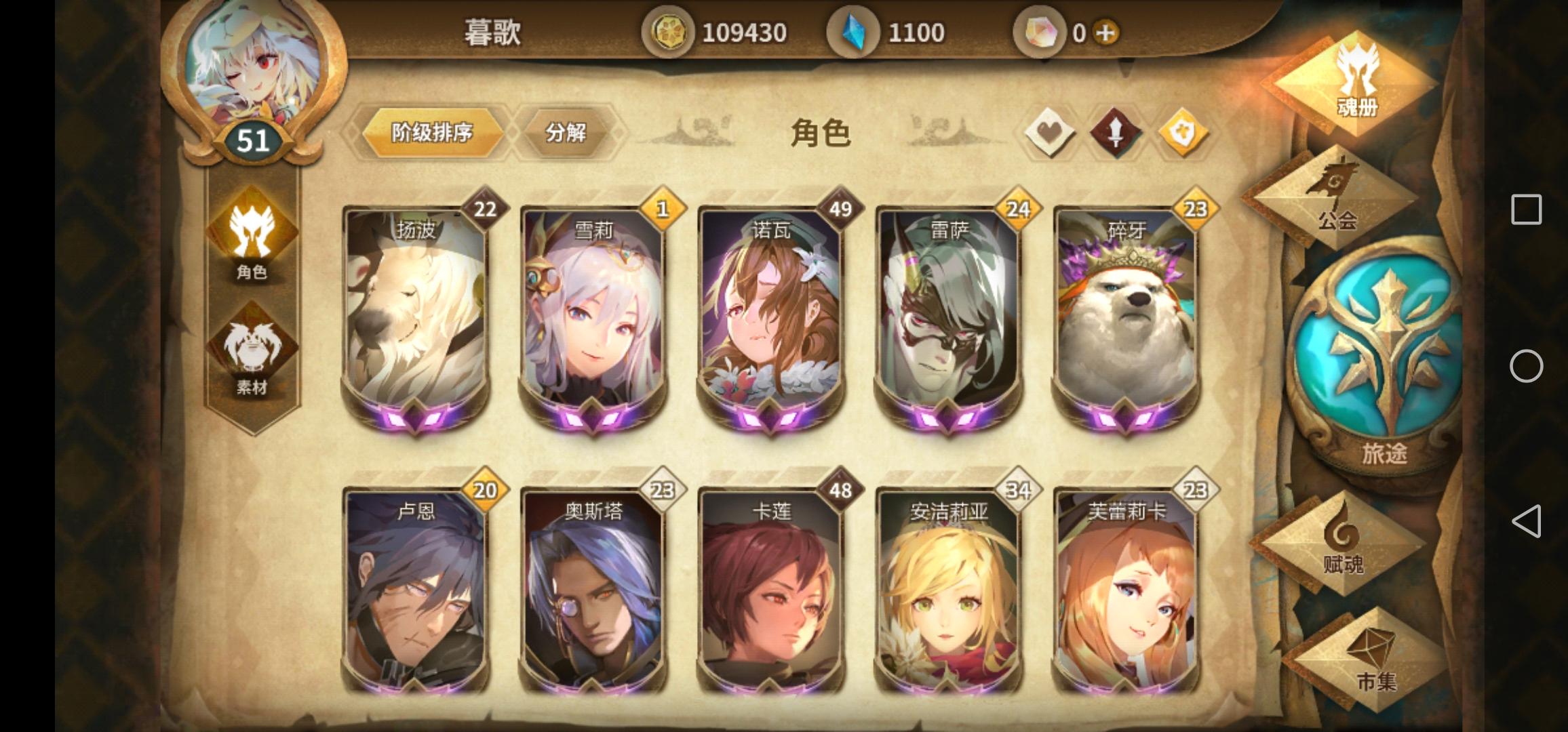 如图,手里的角色有这些,玩的时间也有两个多月了,之前加的公会因为活人太少所以退了,每天都会刷幻境,公会任务也会尽力去做,希望来个公会收留我(本人是妹子哟~)