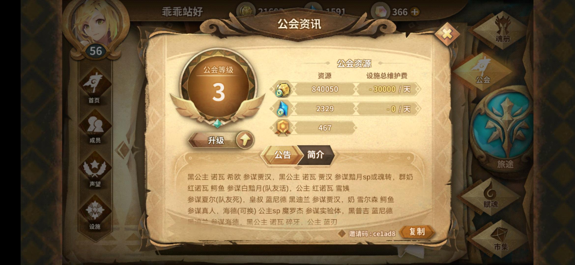 公会名:夜语公会等级:四级公会邀请码:827433公会人数:12要求:7天不上踢,一天至少捐献4500库伦