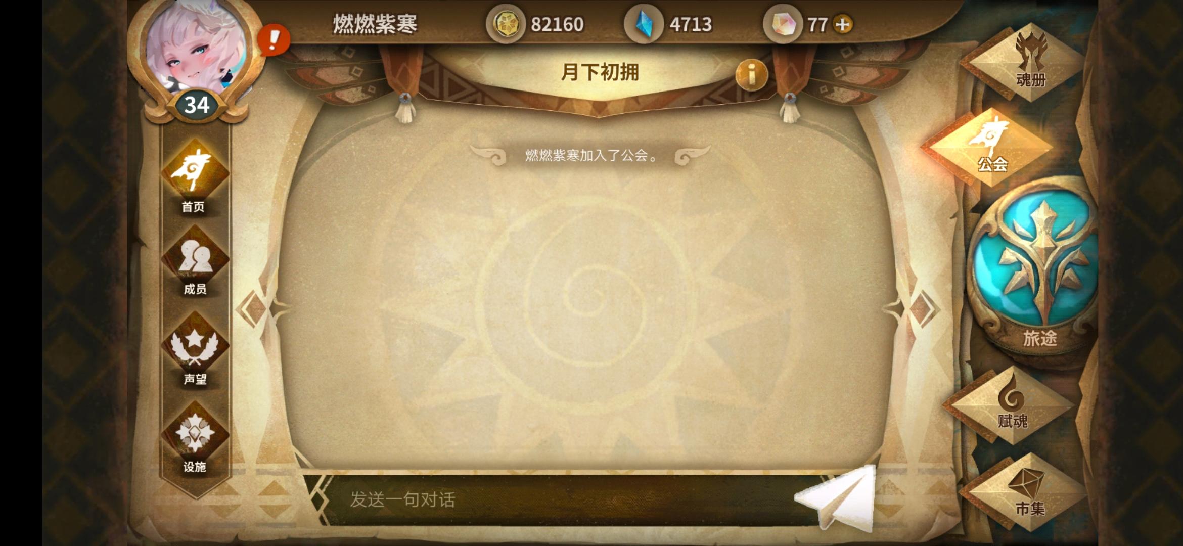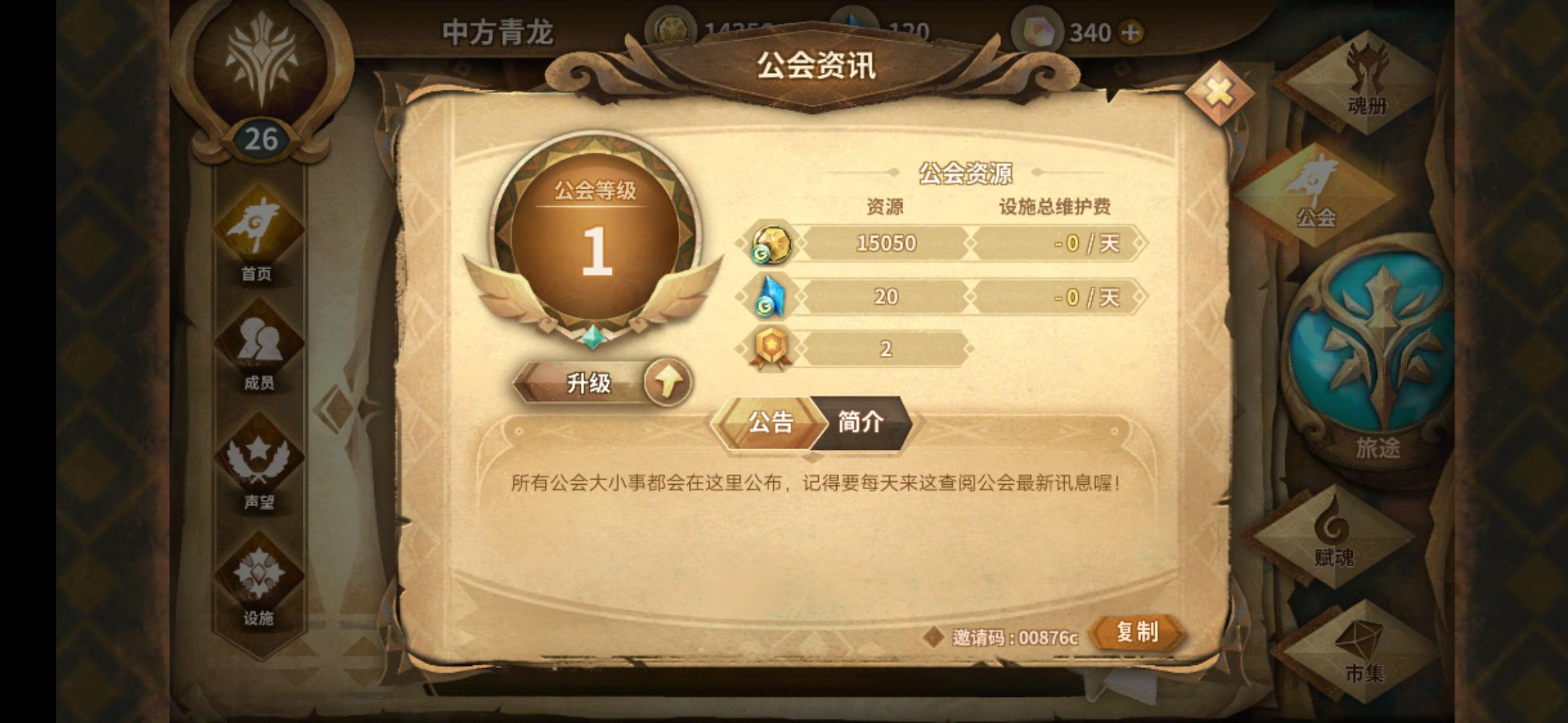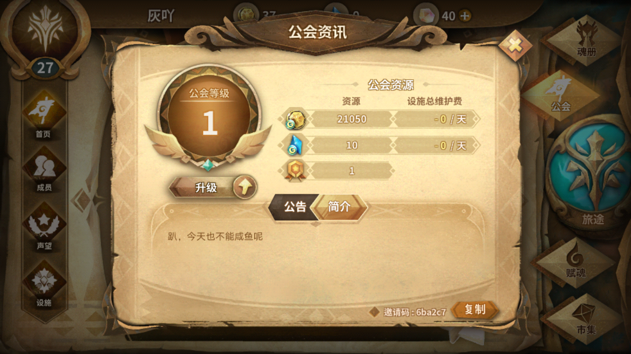 回归萌新号等级低没声望,所以没有人要,相信有很多萌新和我一样的情况,。自己建立一个工会,不介意简陋的可以到我的工会来过渡一下,邀请码:ce1ad8