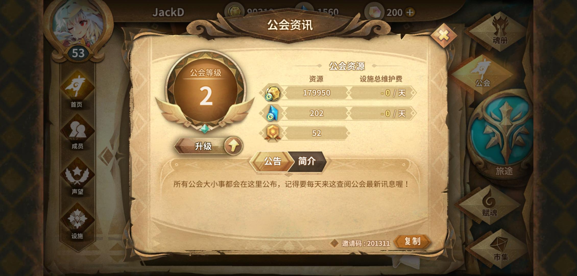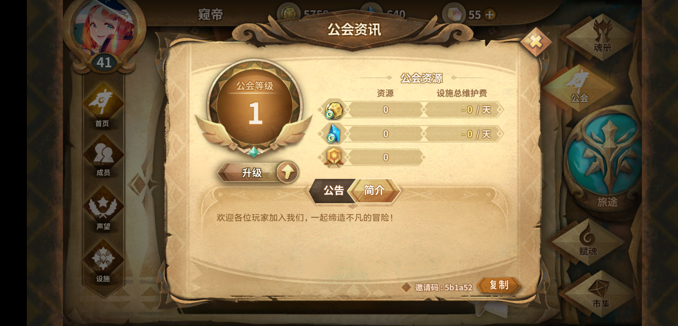 新建公会求新人,本人42级萌新希望有人一起玩,我可能有很多不懂的地方,但公会里有一个大佬了哦,虽然才两个人的新建公会,但可以一起发展,欢迎h加入