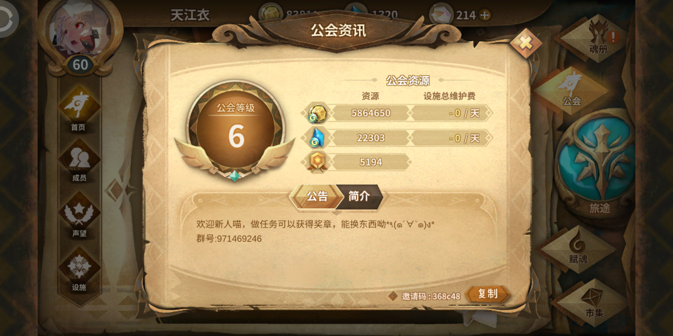 活跃人员短缺,设施暂时未开。无声望等级要求,申请即可加入。(可能还得招个社长,几任社长都要沉迷学习了0.0)🤗欢迎进群一起叭叭。(不强制加入)邀请码:368c48群号:971469246