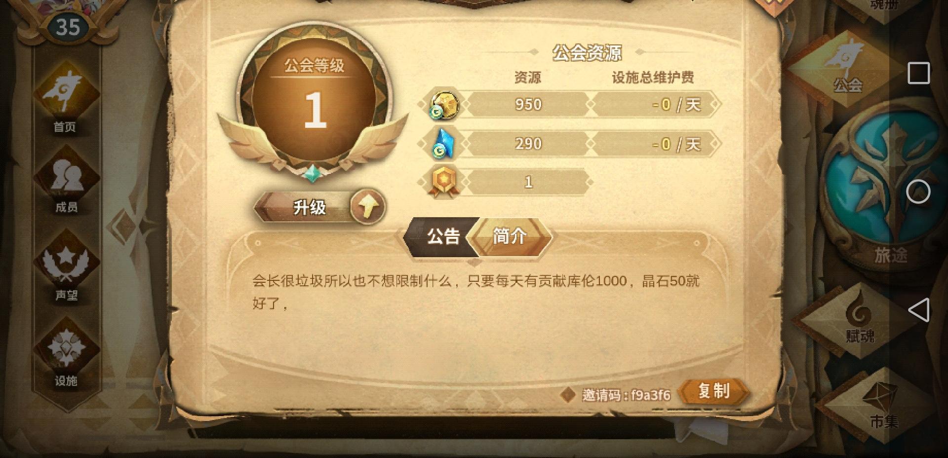 八级工会 江南 欢迎萌新加入,公会对任务和捐献没有要求,当然设施也基本没开(活人太少了),萌新可以慢慢发展,慢慢提高声望,再去加满级公会(满级公会一般有捐献和任务要求)。邀请码:bb626f