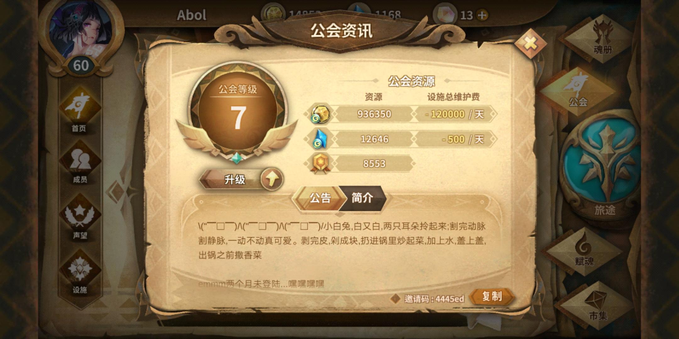 以为进不了好公会的😓0a17f8来几个人吧😭,进公会发邀请码