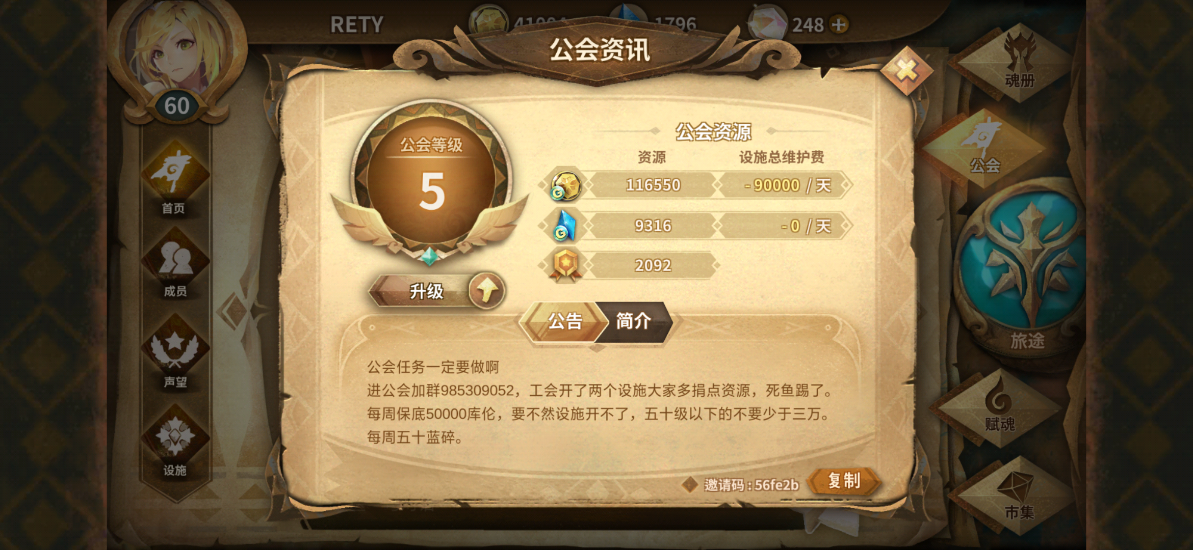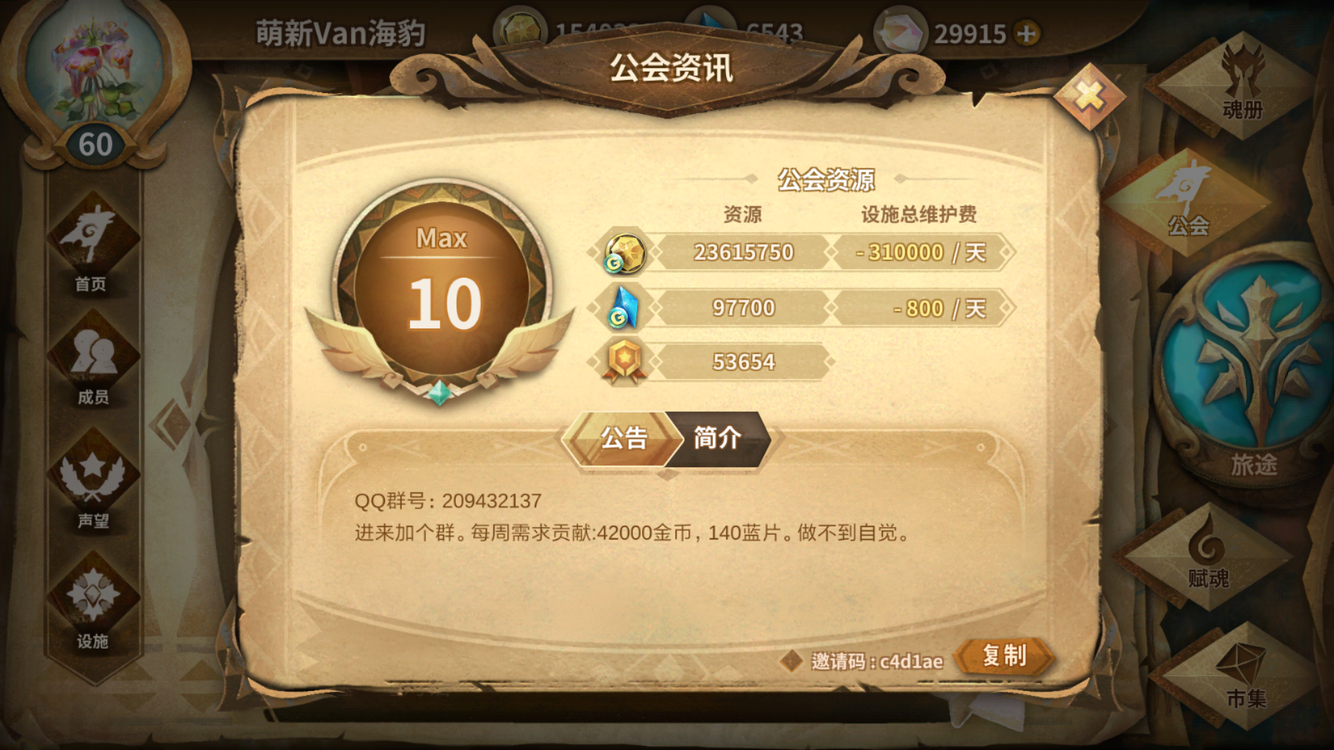 10级老公会了设施全开要求声望6级以上。(名额不多)要能作公会任务的,不喜欢做任务的还想吸血的请绕路公会群还算热闹,有几个可爱的小改改会经常出来聊天。。。所以那种半新手玩家来问问题有一堆老咸鱼来做回答的。群号:272503131下次我让公会里可爱的妹子来收人好了。。感觉我这张脸刷不动了2333