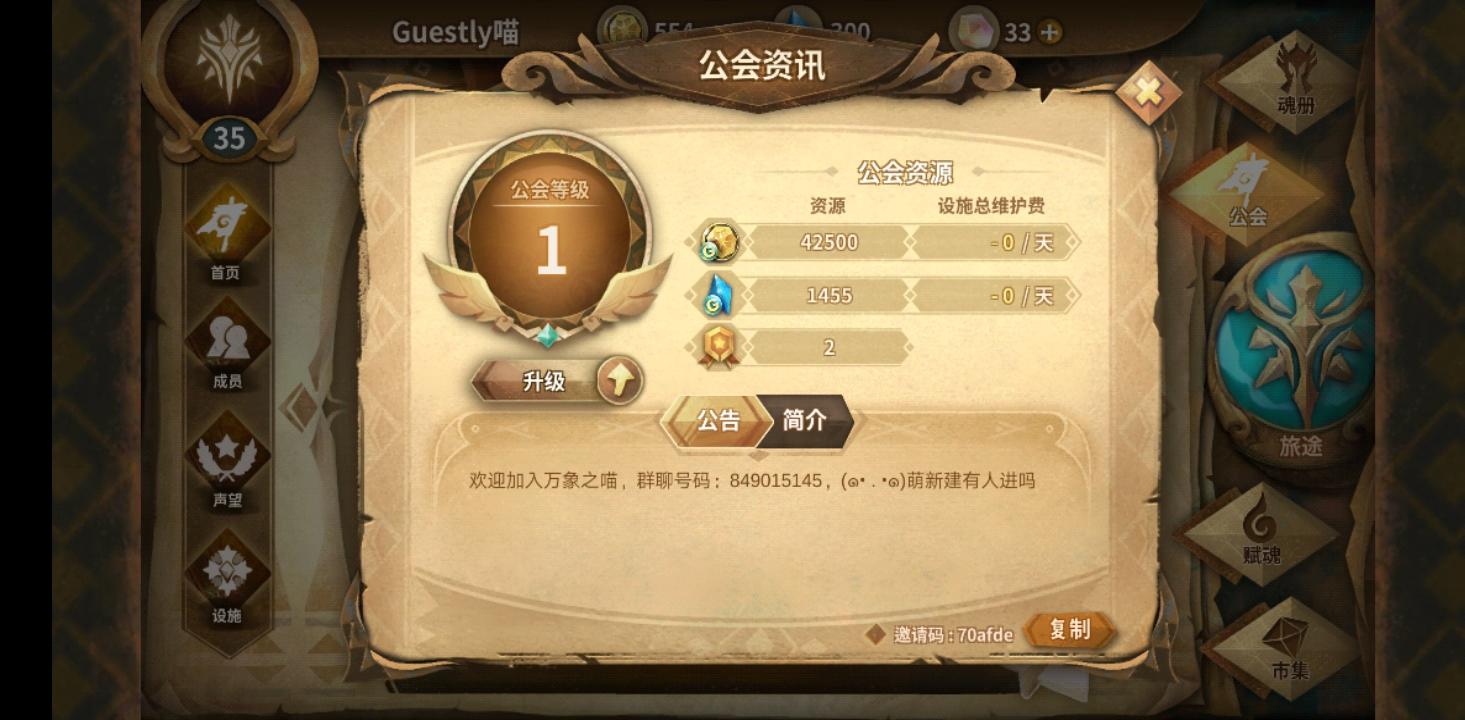 石头号没声望大公会很少接收,干脆就直接自己报团吧。雪纹书库新公会「雾以泪聚」招各种萌新大佬常玩玩家。不管是休闲养老还是攒声望都尽管来,公会不设要求也没有QQ群,每天把任务做了就行,等以后开了公会设施再每周捐点资源维护一下。神秘代码:1dbac9