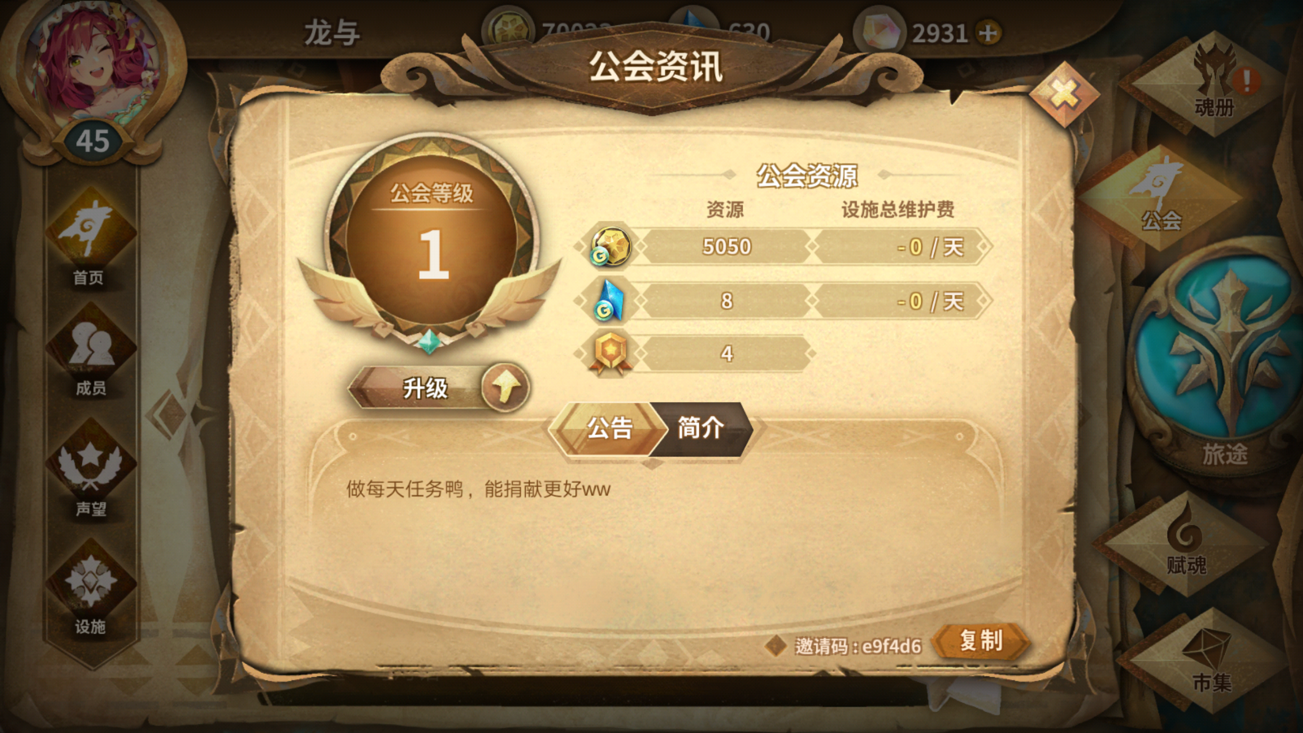 我们公会由于没有萌新报道,所以群里只剩下一堆老咸鱼和我们这堆萌新,我们公会要求就只有每日完成公会任务(讲道理这个很基础了),公会的福利也很多,目前公会有三个机器日常运转(石头,素材还有兑换)我们机器肯定还会再开的,招萌新也是想多开机器,改善公会的环境,群里氛围绝对很好,大家平时也都是什么游戏都聊(一堆宅男什么都玩过。。。),我们群里现在没有什么新人也一直很苦恼,在此召集萌新,公会肯定是能升到9级,