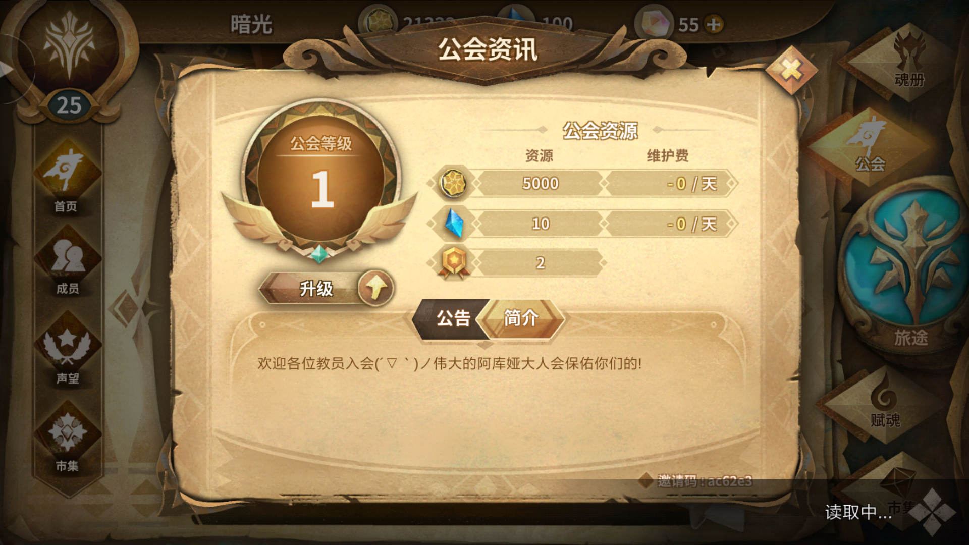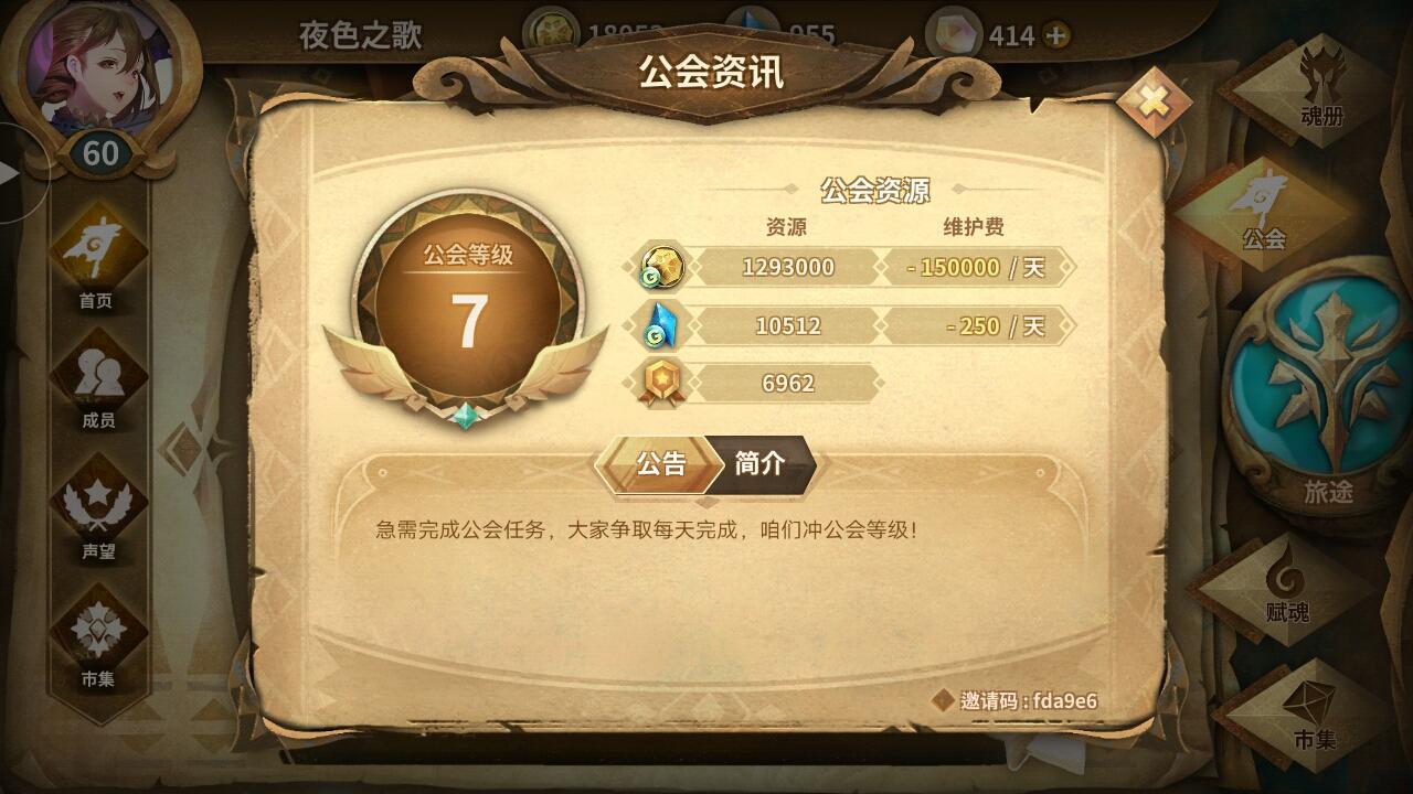 7级工会,邀请码16181d,由于最近公会里退坑的越来越多,需要新鲜血液来活跃一下公会,无论是养老咸鱼或者萌新都欢迎啦,萌新的话公会任务可以量力而行,有能力就捐捐蓝碎,毕竟还是皮肤重要嘛。最后祝有意向加入的各位都欧气满满!