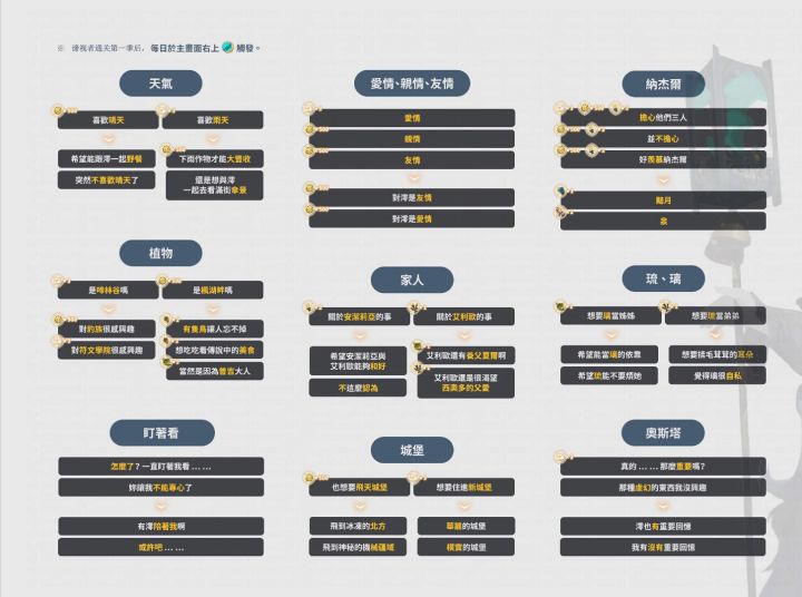 非主线类 篇注:括号内为本人随笔、猜想,非官方内容 。感觉从对话中可以了解到更多的剧情,对一些世界观也有更清楚的认识,干脆发个帖子来查找隐藏的真实(记录一下和澪的甜美爱情×附上一张日常对话图*原图某位大佬,可是我不记得哪找的了 40p 98p(不定时更新完善)