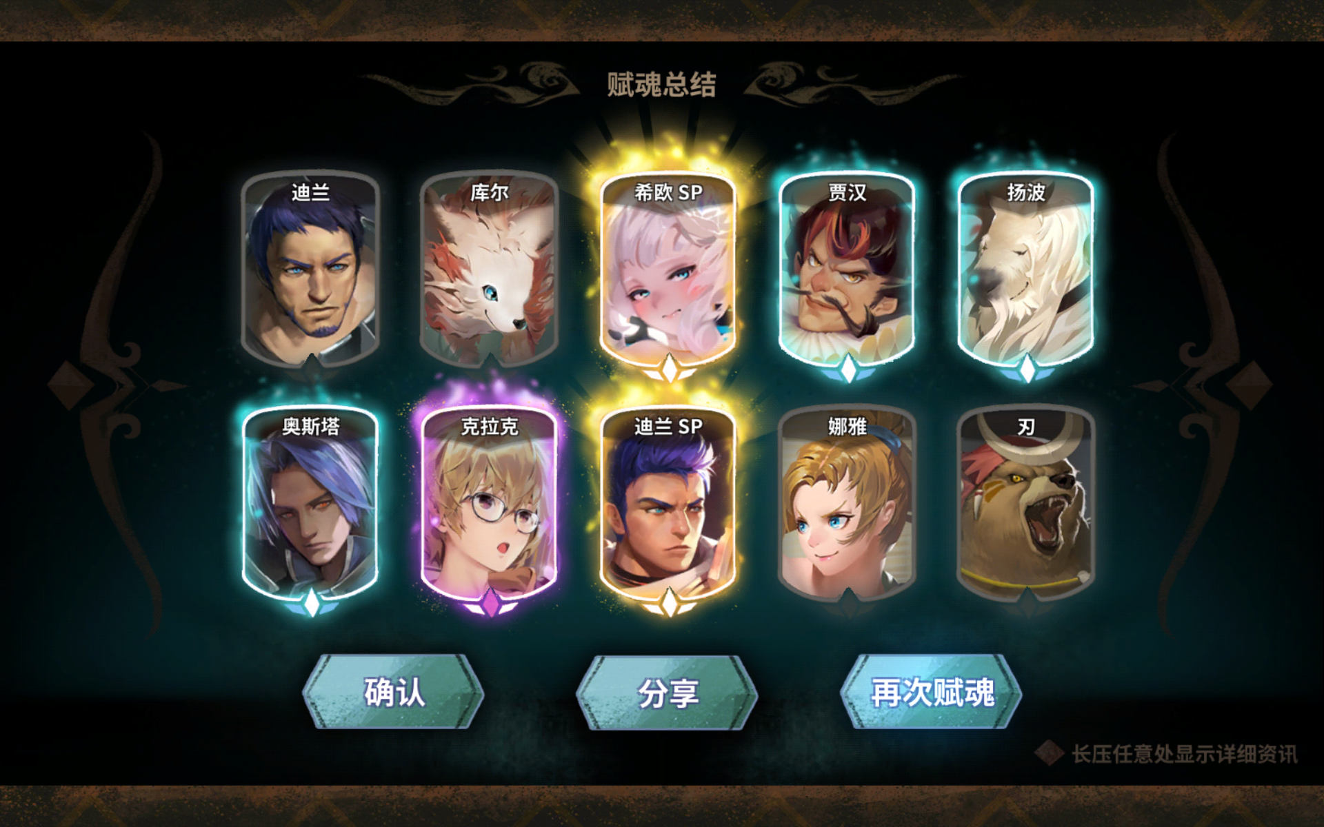 这期池子三捞三,第一天来了一发十连试水,出了cosp,就打算停手的。今天打幻境粘液关,发现我的克拉克老是第五回合罢工…出不了分,气死了,就准备去这个池子抽个克拉克,对金根本不抱希望。好家伙,看到这一幕我心跳加速,觉得属实赚翻了,再不济也有三个紫了。满怀期望的继续点。出现了这一幕真不错,四个紫,总不会没有克拉克吧。好家伙,开的时候真把我看傻了,这这这,居然出了俩金仨紫!!而且金还没有重复…