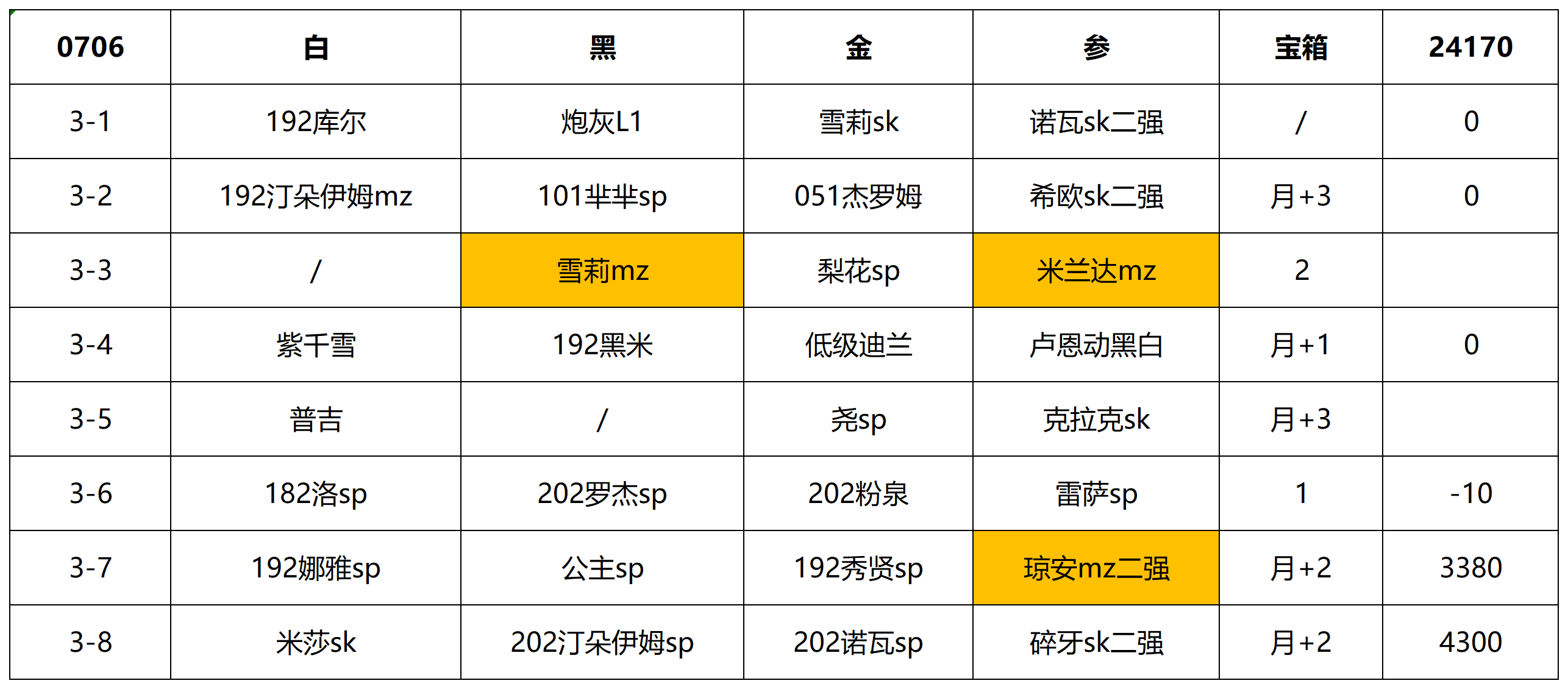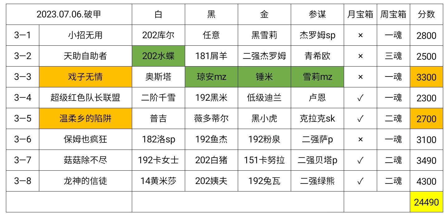 照例咕咕的第二周 (趴)愈发期待四强了 储蓄强化材料 乐幻境改版应该也会跟四强一起来 看这个样子四强可能会留到9月份也说不定 不知道新来的四个关卡会是什么机制呢()久违的传送门 31 无箱 -0水泉172+奴莉192+姨母+二强童尧p1 开局指奴莉 指2黑3 p2开局不动 指2金2p3开局指奴莉 黑1 p4p5开局指奴莉 指2黑332 无箱 -0批脸202+屑羊202+杰罗姆1