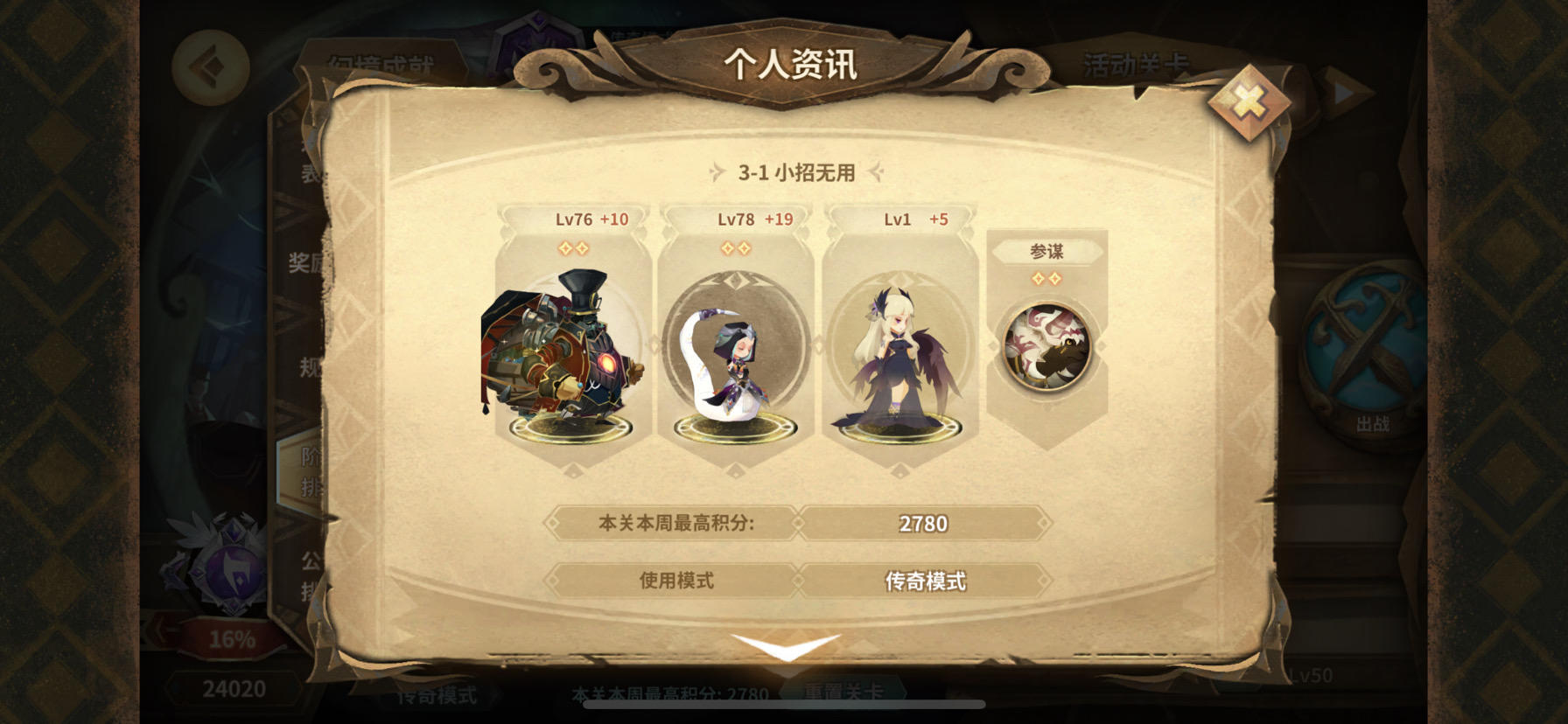 -配队操作均根据个人练度与卡池,仅供参考【3-1 小招无用】月箱✓,周箱:白p1:白1,随意(sl个白4)p234:消金或黑,(防止最后一面没白魂)p5:白4,白1--------------------【3-2 天助自助者】月箱✓,周箱:白每面:开局指黑,指白 金4*n--------------------【3-3 戏子无情】月箱✓,周箱:×金3*n(适当用白1回血,看情况
