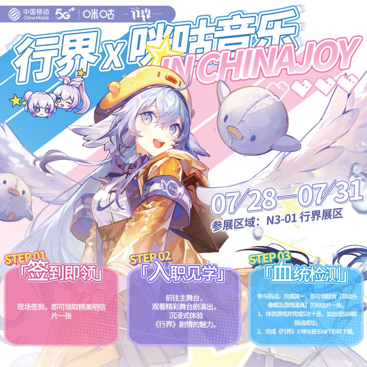 《行界》x咪咕音乐 ChinaJoy2023 现场活动解禁!>>>参展信息【地点】上海新国际博览中心【展位】N3-01 行界区【时间】2023年7月28日-7月31日step1>>签到即领-现场打卡并体验游戏,即可获得限定明信片!step2>>血统检测-根据指引完成抽卡&下载咪咕音乐联动彩铃,即可获得限定头像框!step3>>入职见学-主舞台演出定期开演,沉浸式体验七院打工生活。