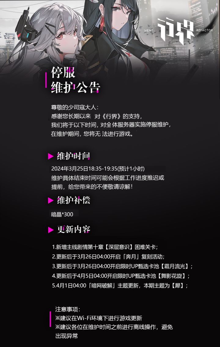 尊敬的少司寇大人:感谢您对《行界》的支持,我们将于18:20左右,对全体服务器进行一次闪断更新,届时将造成各位强制掉线,您需要重新登录拉取热更新。=更新补偿=1、闪断更新补偿:暗晶*300=更新内容=1.2024年2月1日4:00「暗网破解」主题更新,本期主题为【犀】。