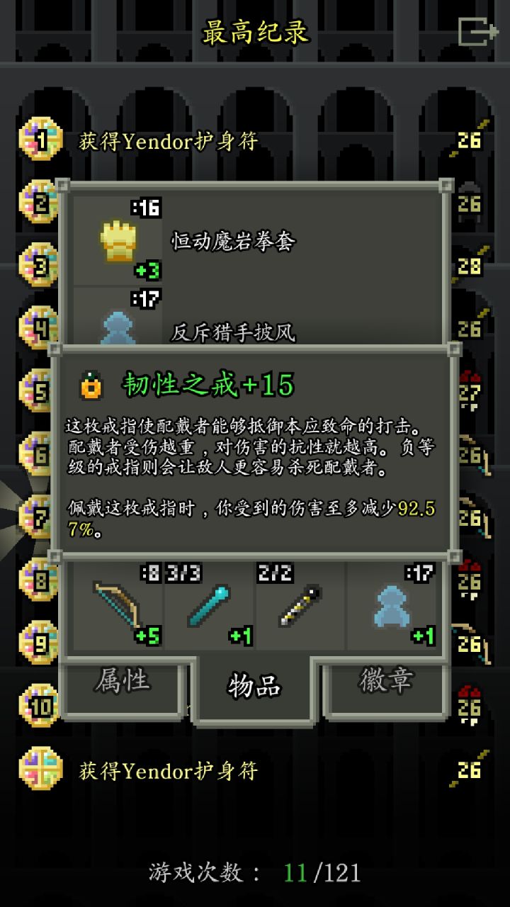 本来是想找个神射之戒再爽一把的,打到16层还是没有,就决定试试韧性之戒。+5 至高55%伤害减免+10 至高80%伤害减免+15 至高91%伤害减免等级越高性价比越低,但是90%的伤害减免还是极其诱人。正如描述血量越低减免伤害越高,大概在20%左右的血量就能减免达到最大值。这个减免是包括几乎所有伤害的(毒,火,摔伤,爆炸,坍塌等 但是即死效果和圣杯没试过),饥饿掉血除外。他的这个特性和