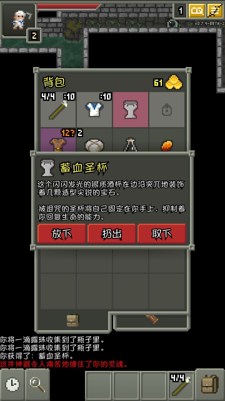 蓄血圣杯诅咒效果为降低回血3/1回复效果为10-神器等级*0.9回合回一滴血升级会受到伤害1-10级伤害分别为1,3,12,27,48,75,108,147,192,243伤害伤害可被抵抗圣杯将造成大于血量的75%伤害时会提示是否升级回1-10升级后回复每滴血的回合分别为9、8、7、6、、5、4、3、2、1石子伤害成长为+1/+2破损的短剑它的伤害成长为1~2,精准为1