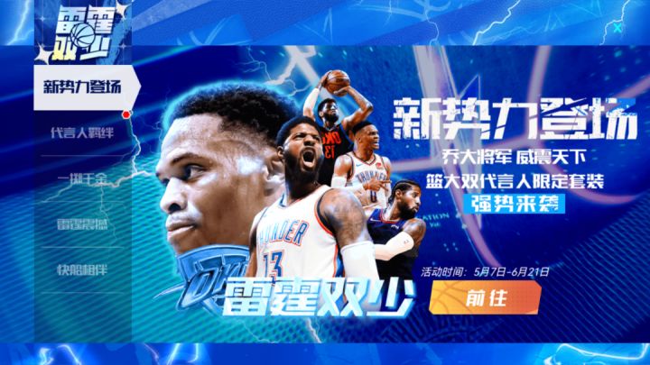 千帆尽过威名扬,乔首以盼再相逢!双代言人重磅登陆!NBA总决赛战火燃起,端午福利活动满满!代言人登场活动时间6月7日18:00-6月21日18:00活动详情双代言人强势来袭!活动期间,可使用【精准招募函】在【精准招募-雷霆双少套装卡池I】、【精准招募-雷霆双少套装卡池II】池中,抽取双代言人的的专属外显套装。每次“抽一次”,则随机解锁一个奖励格,获取奖励格中的“外显套装”等奖励