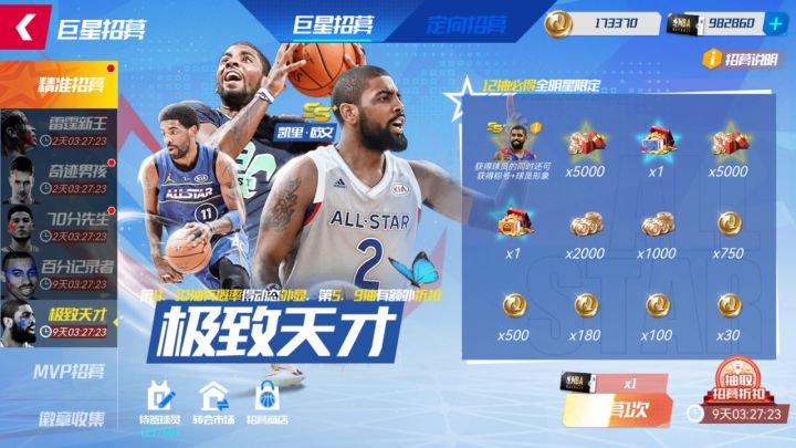 欧文张伯伦齐返场!折扣活动嗨不停!球员特性:欧文:全联盟独有的气势保留机制,助你更快再次气势爆发!张伯伦:勇士队的擎天玉柱,让勇士套成为联盟最强进攻之矛!精准招募-极致天才活动时间3月29日18:00-4月5日18:00活动详情新增幸运转盘折扣!活动期间,可使用【精准招募函】在【精准招募-极致天才】池中,招募全明星队欧文。每次“抽一次”,则随机解锁一个奖励格,获取奖励格中的“全