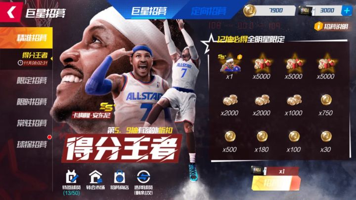 精准招募-得分王者活动时间8月5日00:00-8月12日00:00活动详情活动期间,活动期间,可使用【精准招募函】在【精准招募-得分王者】池中,招募全明星队卡梅隆·安东尼。每次“抽一次”,则随机解锁一个奖励格,获取奖励格中的“全明星球员”或“转会费”。至多抽取12次,成功将全明星队卡梅隆·安东尼签约入队!🌟TIPS:每次所需的精准招募函,将根据抽取次数递增。超值0元购活动时间8月