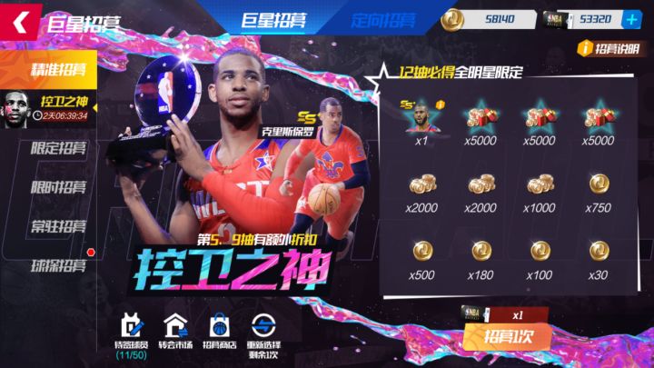 “诺天王”——全明星德克·诺维茨基“控卫之神”——全明星克里斯·保罗共同返场为你的球队补充中坚力量!任选精准招募活动时间7月22日00:00-7月29日00:00活动详情活动期间,可在控卫之神(全明星克里斯·保罗)、德国战车(全明星德克·诺维茨基)中任选卡池进行招募!选择了卡池后,在限定次数内,可以随时手动重选切换卡池(最多可重新切换1次),重选卡池后,当前卡池已招募进度将刷新,