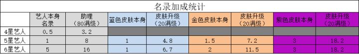 游戏内暂时没有皮肤名录统计筛选和皮肤升级增加名录数值说明功能,下面整理了助理提升、皮肤升级对名录的提升数值说明,欢迎各位导演查看。PS:不同版本可能有稍微区别,请已当前版本为准。①名录加成统计 1、助理等级提升名录:4星初始0.5%5星初始1%6星初始5%和艺人助理等级挂钩满级80级4星每升5级加0.2%满级3.2%5星每升5级加0.5%满级8%6星每升5级加1%满级16